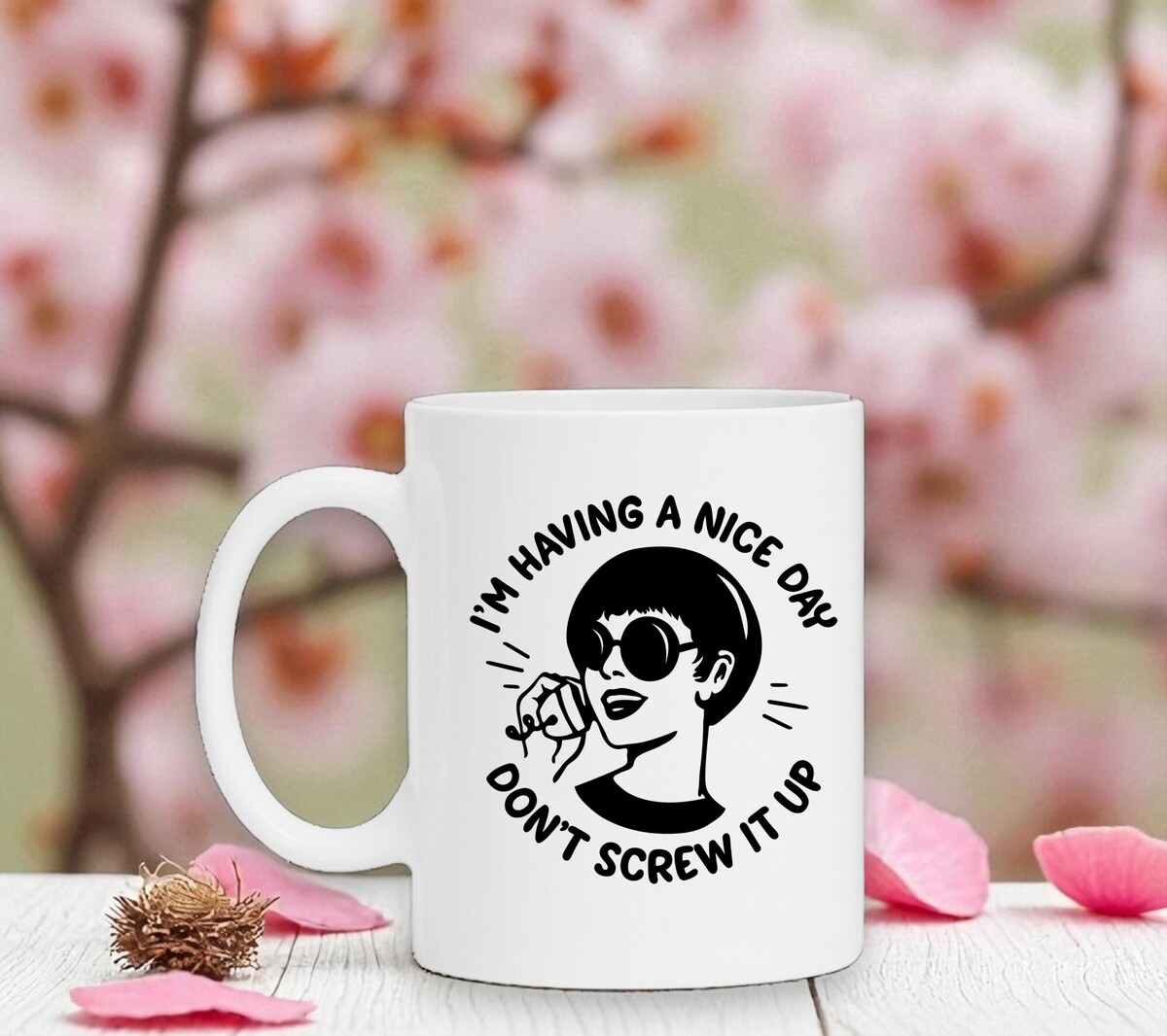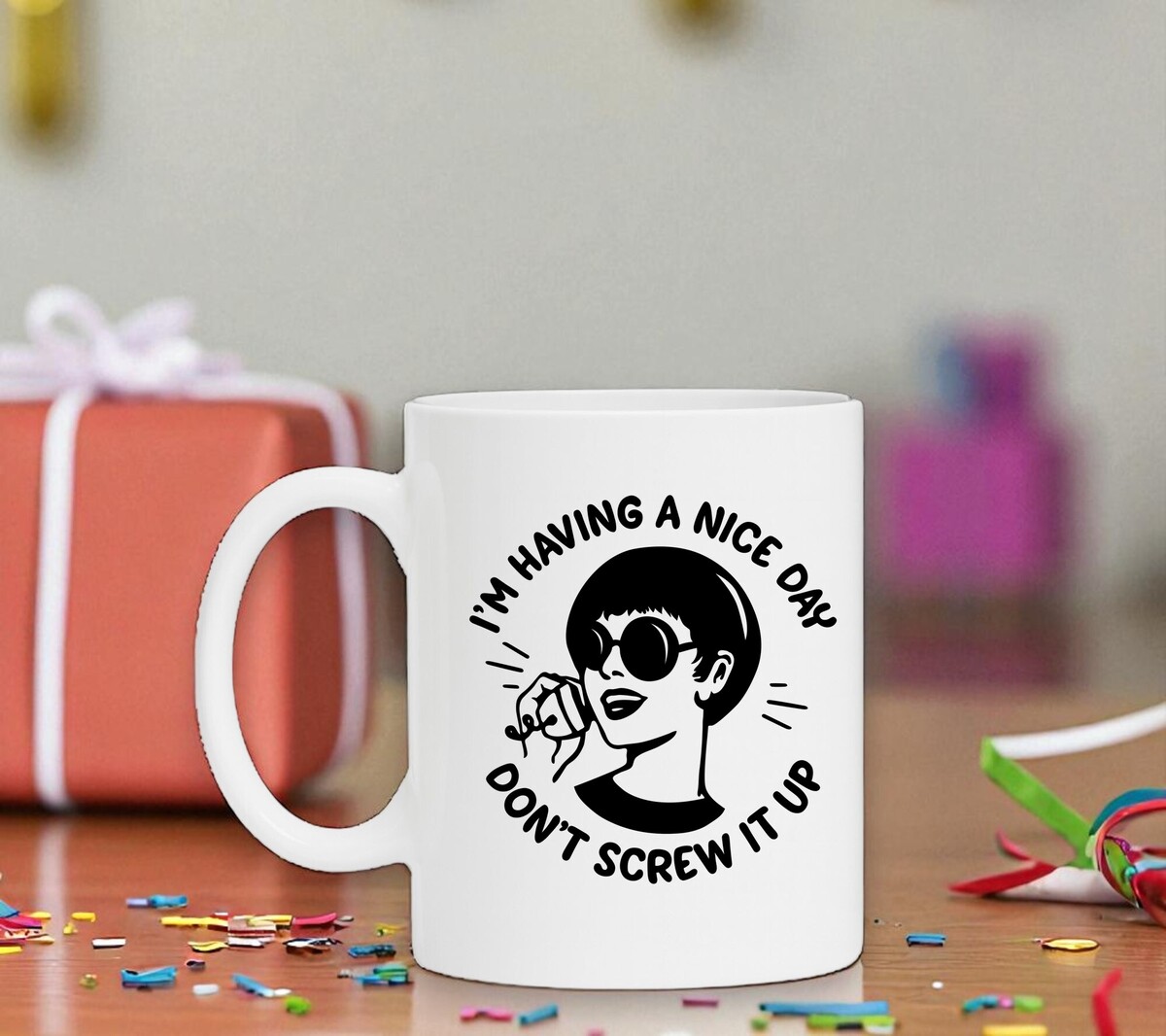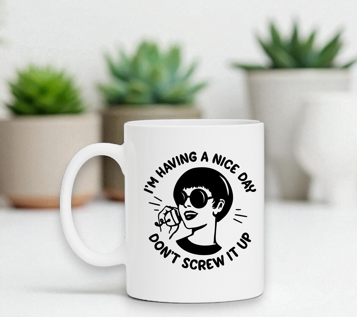 Leuk mok voor op het werk als het helemaal jouw dat is! Having a nice day dont screw it up! De mok is vaatwasserbestendig en heeft een hoogte van 96mm en een diameter van 80mm.