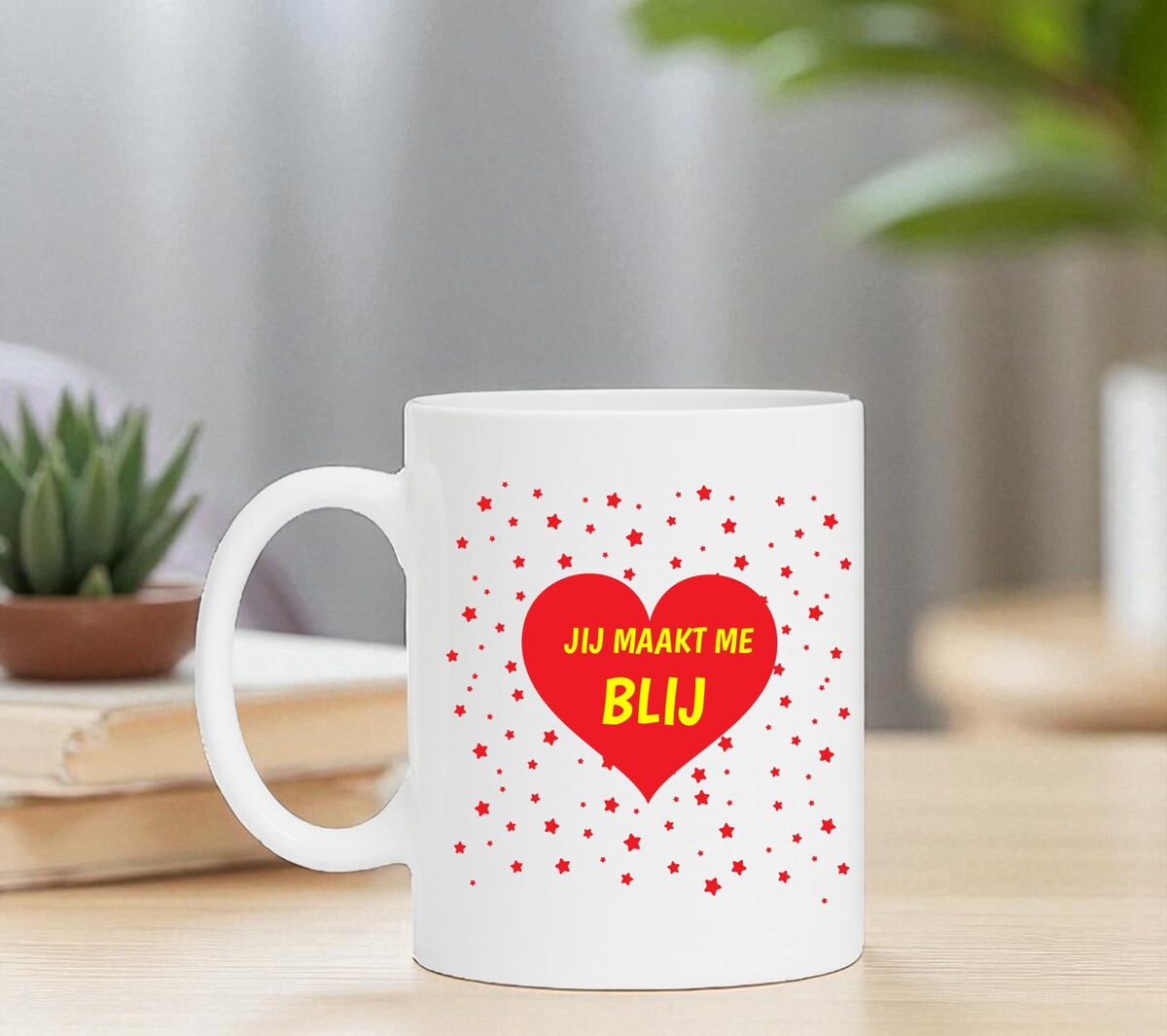 Een lieve vrolijke Valentijn koffiemok om hem of haar je liefde te laten zien. Maar niet alleen voor Valentijn natuurlijk wat dacht je van Moederdag, Vaderdag, of gewoon een verjaardag. Op de koffiemok is met gele letters in een rood hart de tekst ‘Jij maakt me blij’ geschreven. Om het rode hart zijn allemaal kleine rode sterren gedrukt!