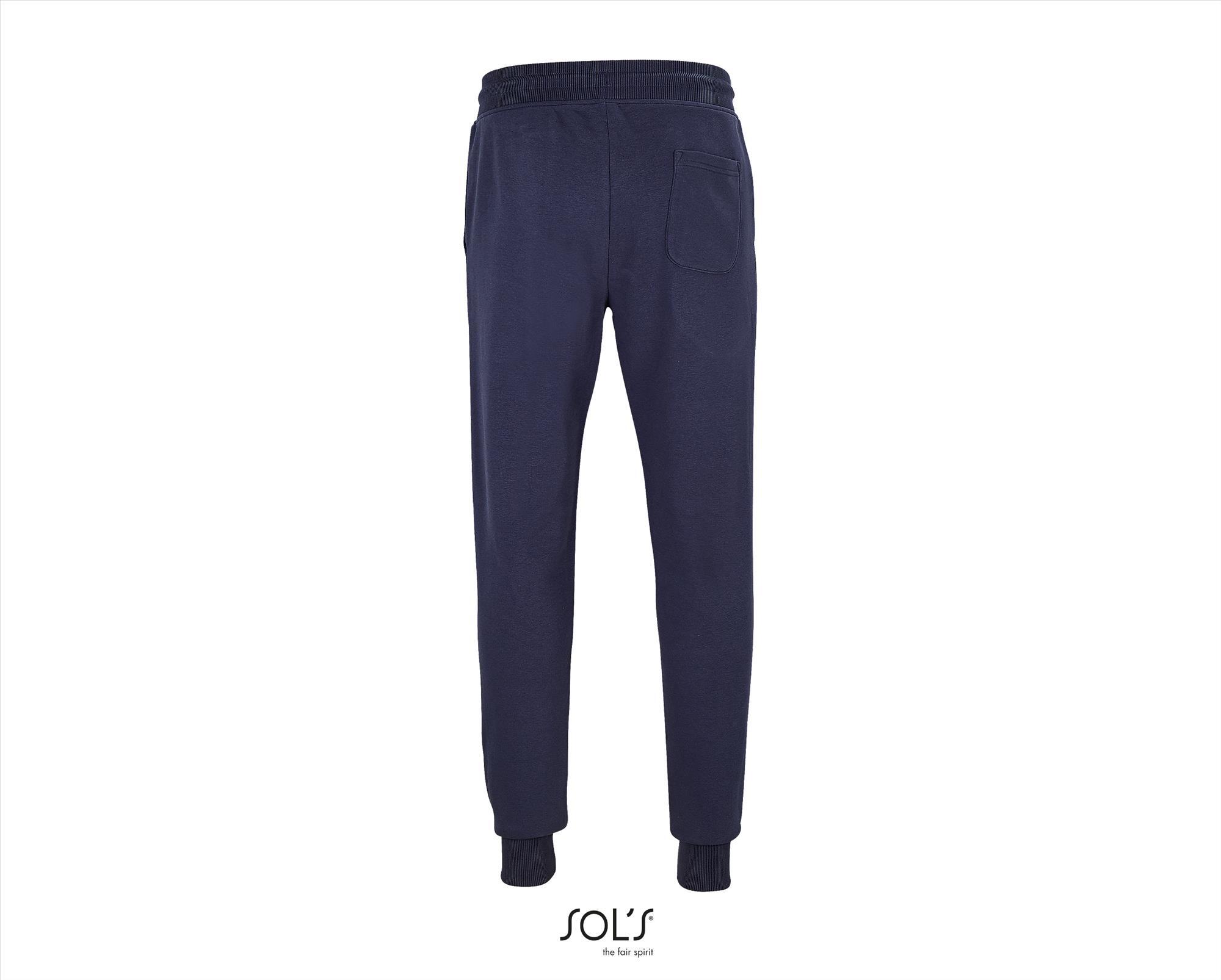 Een joggingbroek donkerblauw voor heren. Merk: SOL'S Jet Men. Materiaal:80% Combed Organic Cotton in Conversion - 20%. Dikte:300 g/m2. Foto met model erop is een sfeer foto kleur buiten beschouwing houden. Land van herkomst:Bangladesh.