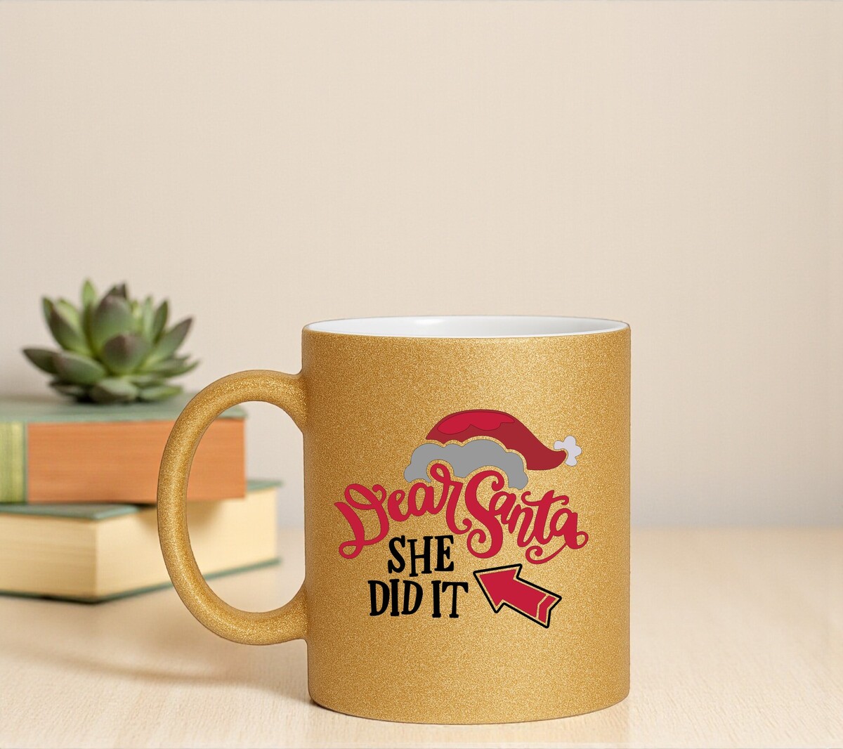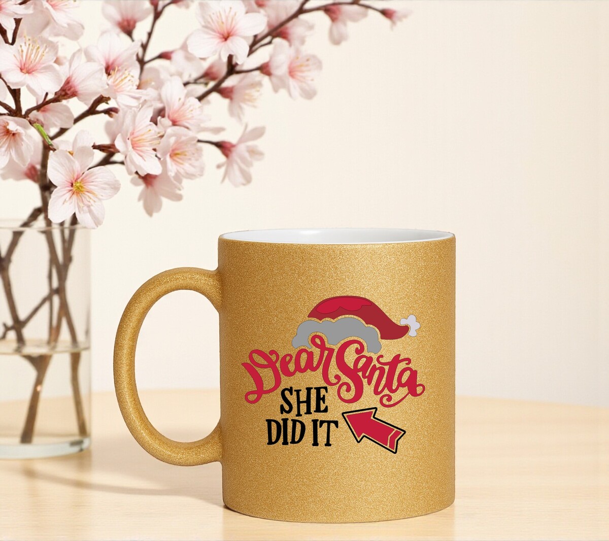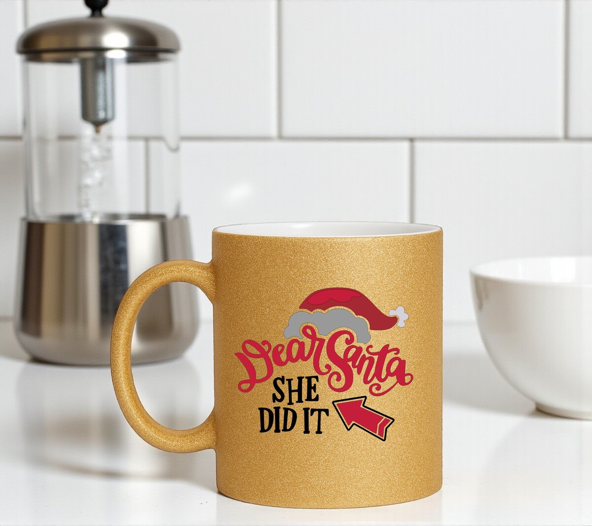 Koffiemok voor de Kerst glitter goud uitvoering met de opdruk dear santa she did it! Handwas aanbevolen! Microgolfbestendig De mok heeft een hoogte van 96mm en een diameter van 80mm.
