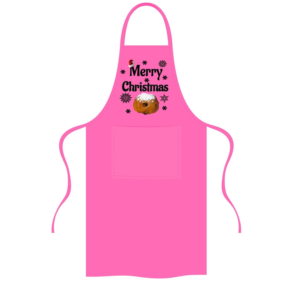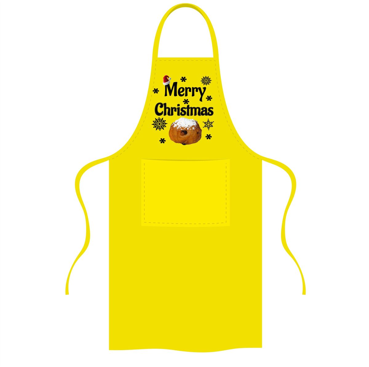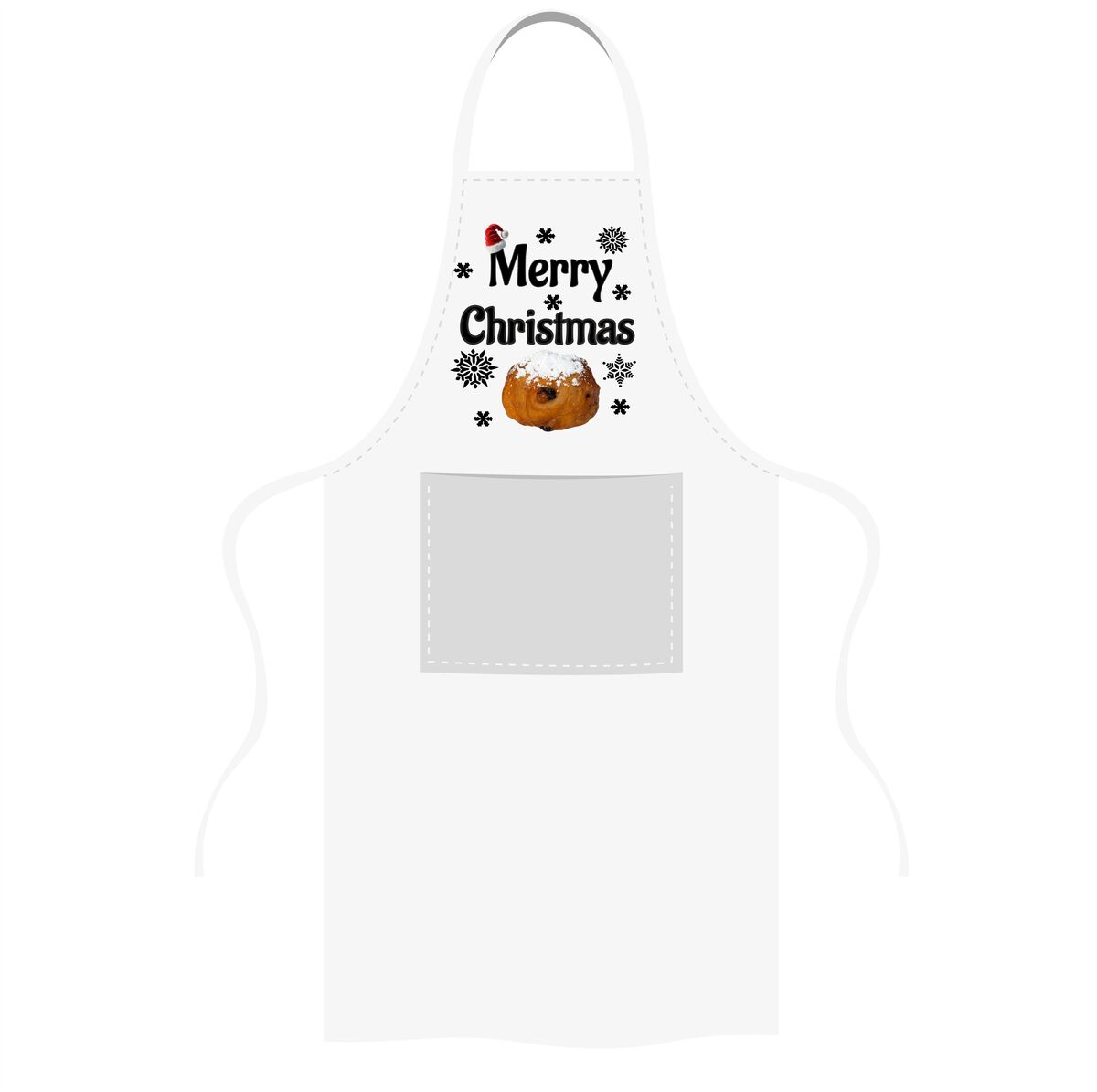 Breng sfeer én een glimlach in de keuken met dit vrolijke kerstschort “Merry Christmas” met een heerlijke oliebol-afbeelding!