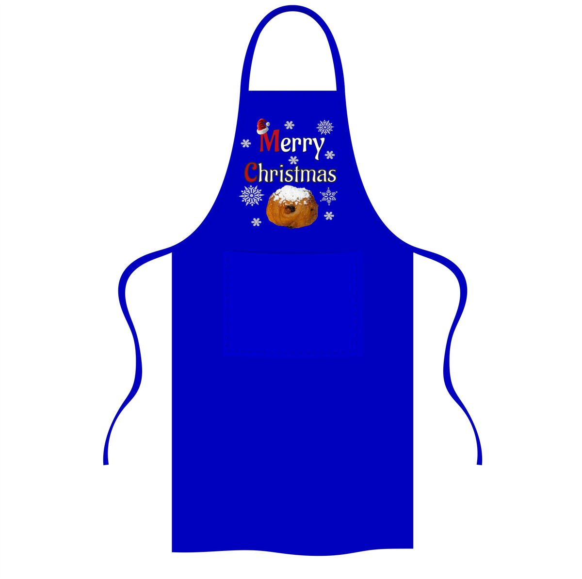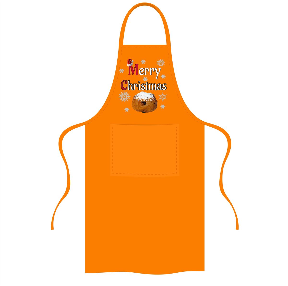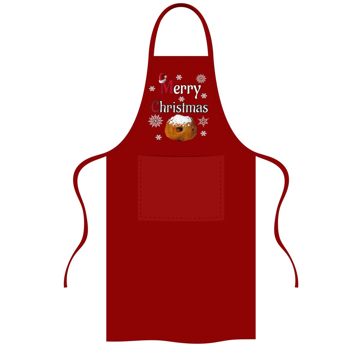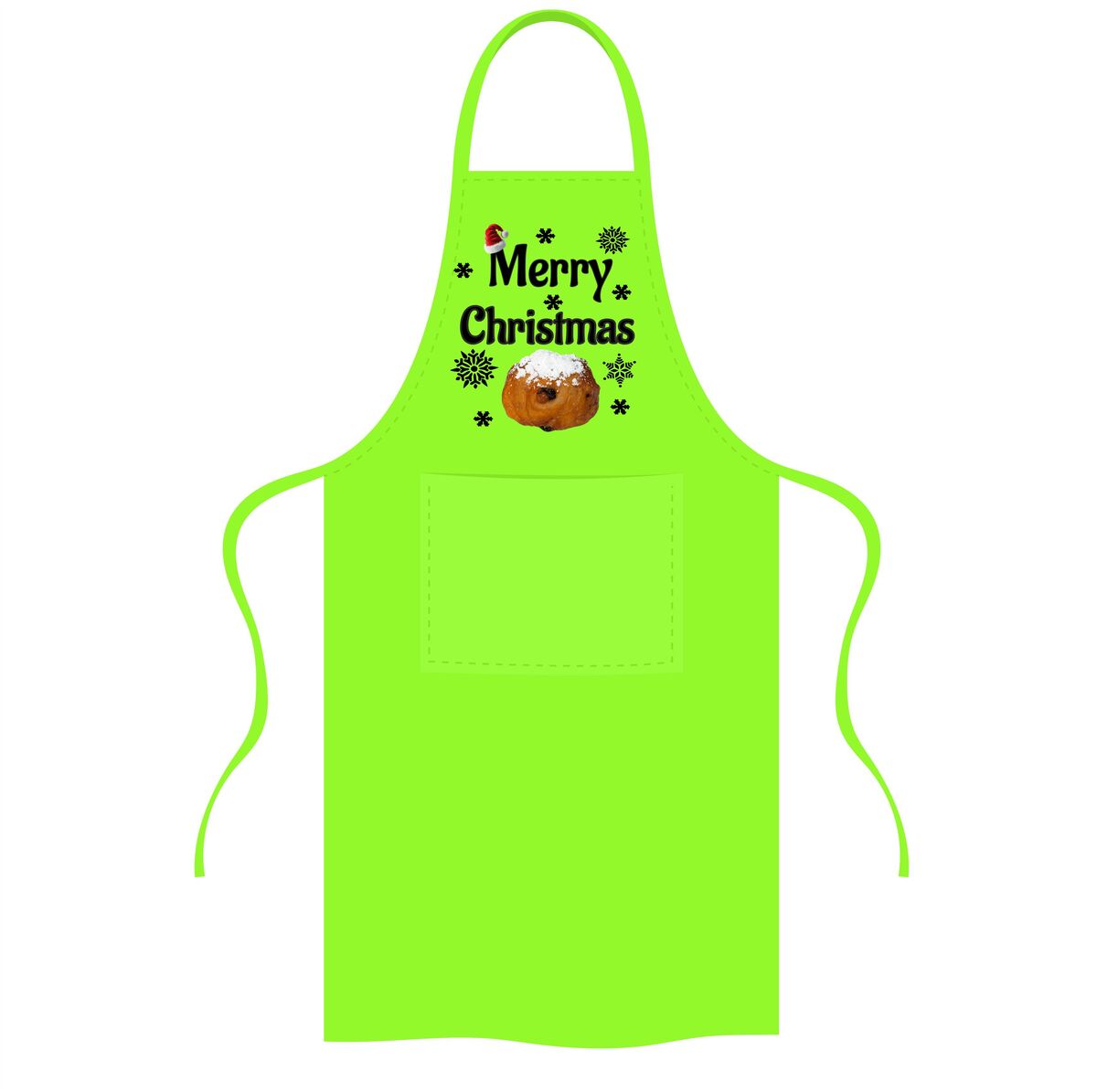 Breng sfeer én een glimlach in de keuken met dit vrolijke kerstschort “Merry Christmas” met een heerlijke oliebol-afbeelding!