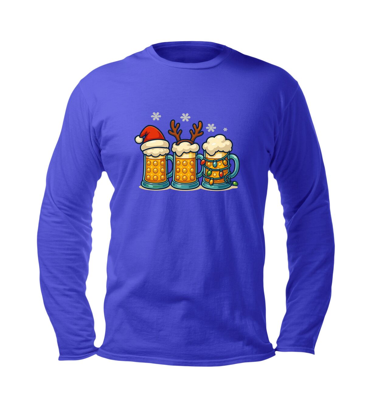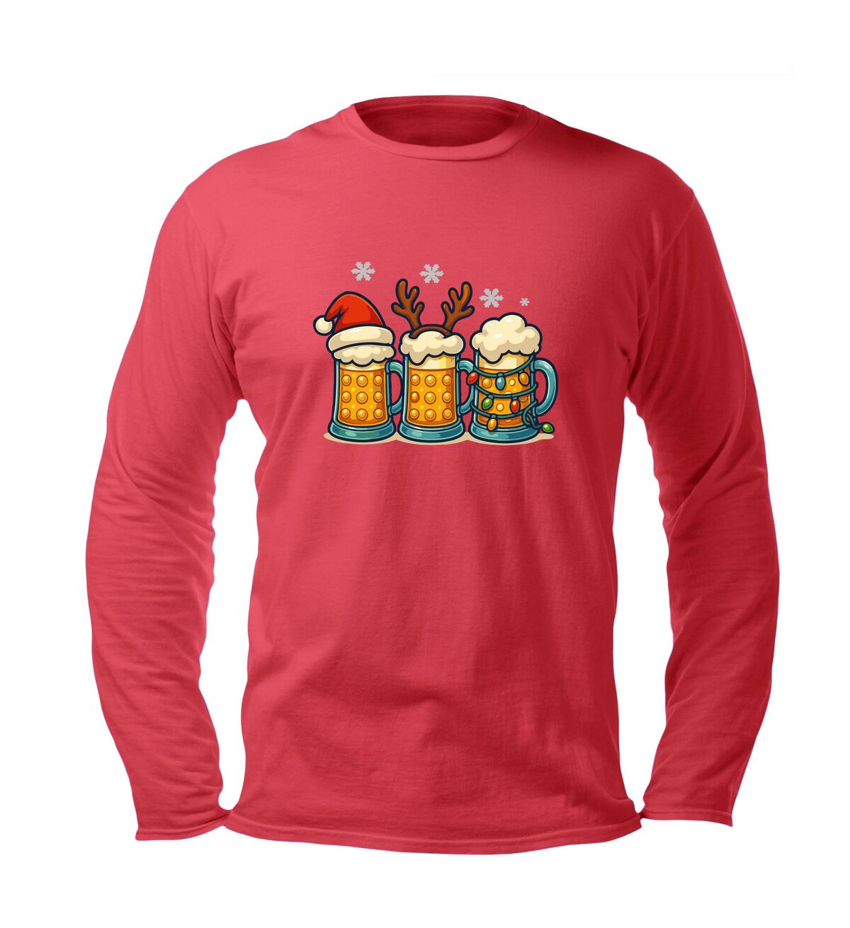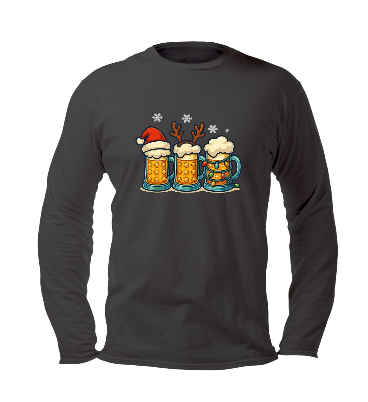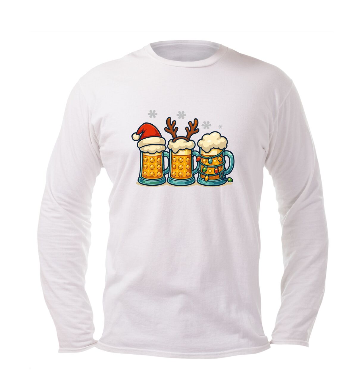 Een prachtig T-shirt lange mouw om te dragen met de kerstdagen. Drie bierpullen versierd met kerst artikelen. Wat wil je nog meer om de kerst fantastisch te maken?