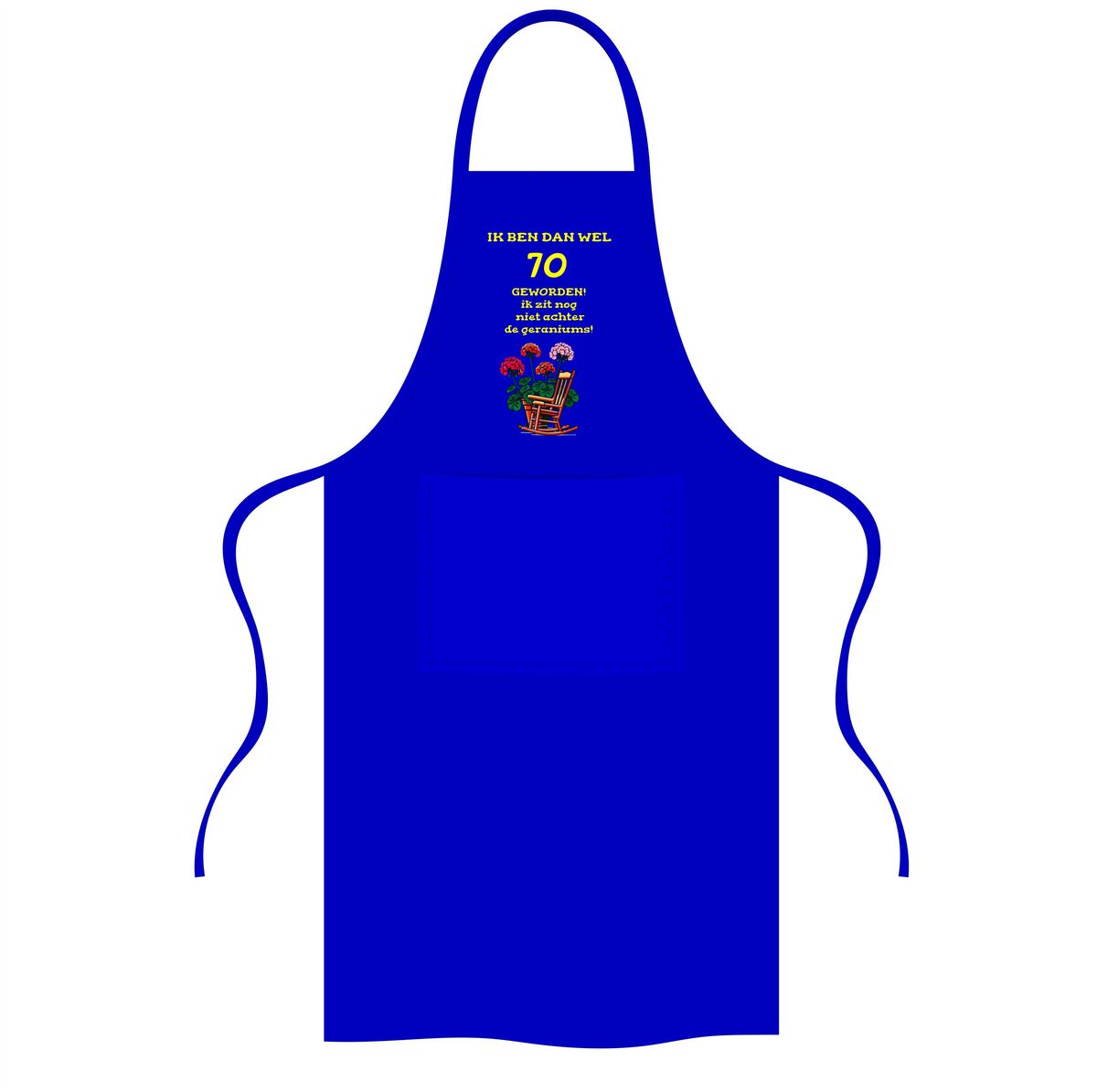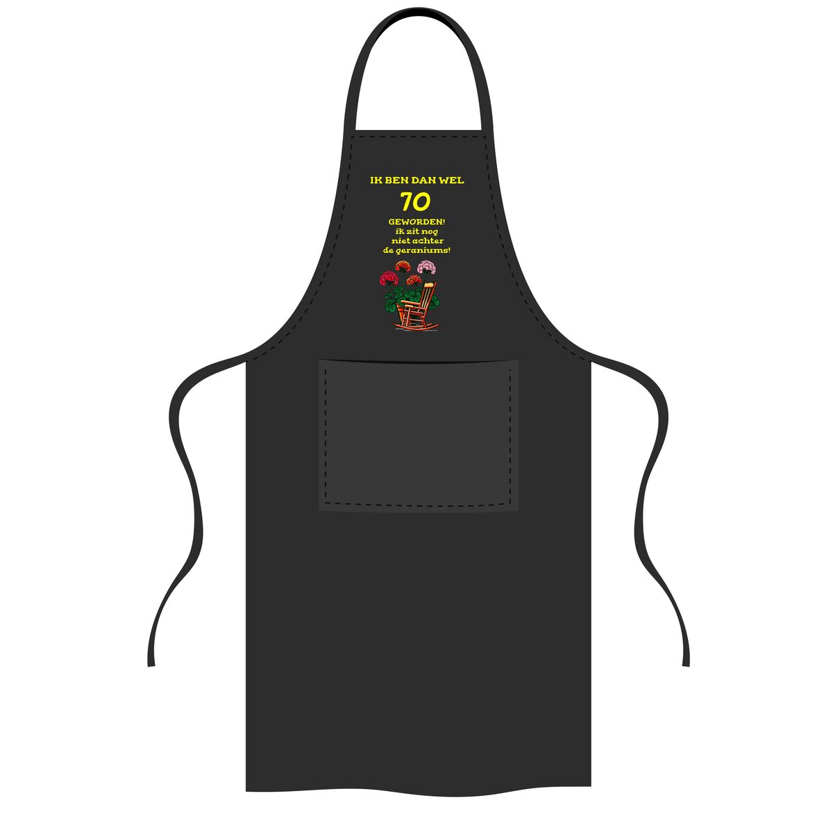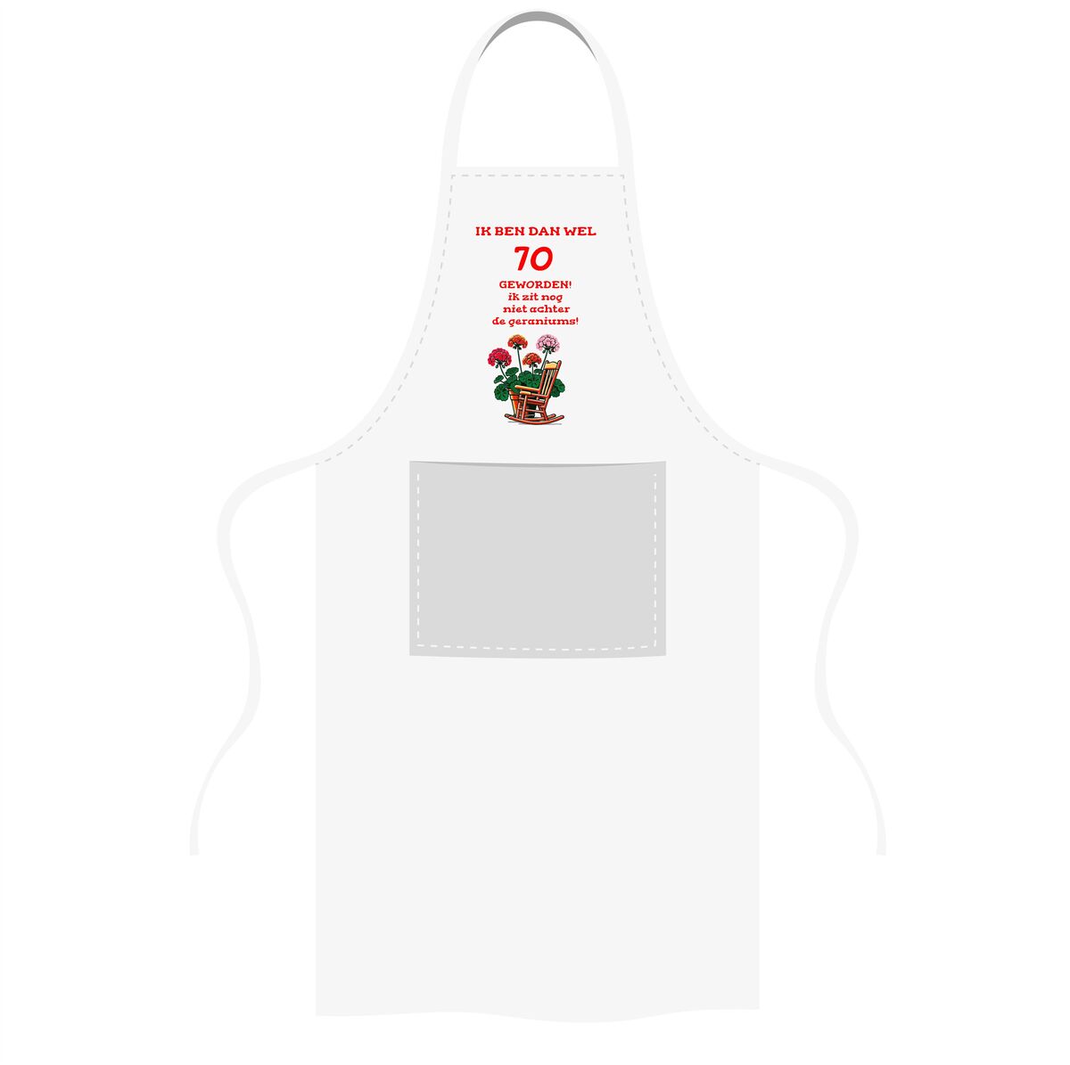 Maak van koken, bakken of barbecueën een extra feestelijk moment met dit schort met de tekst Ik ben dan wel 70 jaar maar zit nog lang niet achter de geraniums. Deze 70 jaar schort is dé perfecte combinatie van humor en functionaliteit en laat op een speelse manier zien dat leeftijd geen reden is om stil te zitten. Ideaal voor een jarige die nog volop actief is en graag in de keuken of achter de BBQ staat.