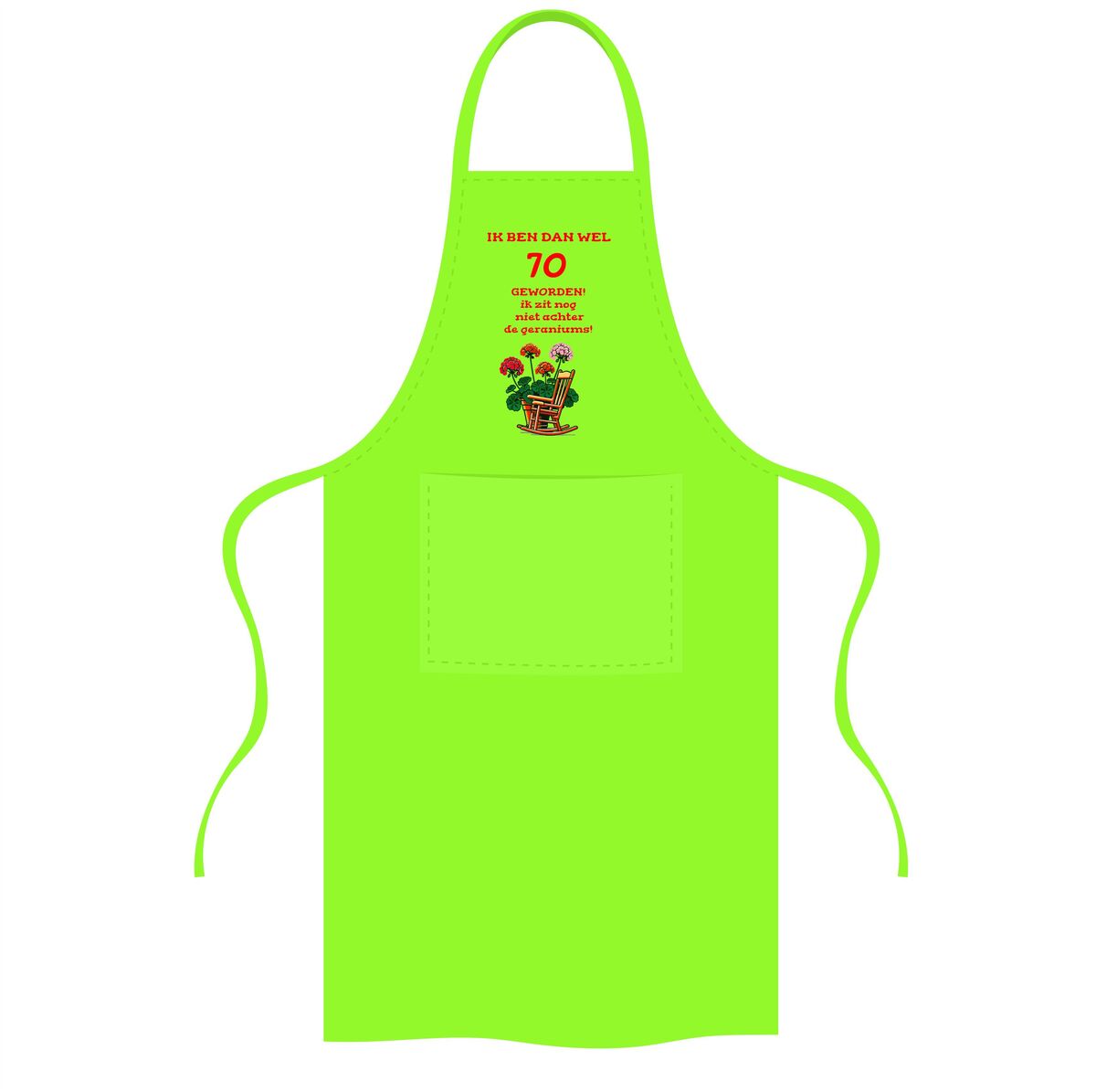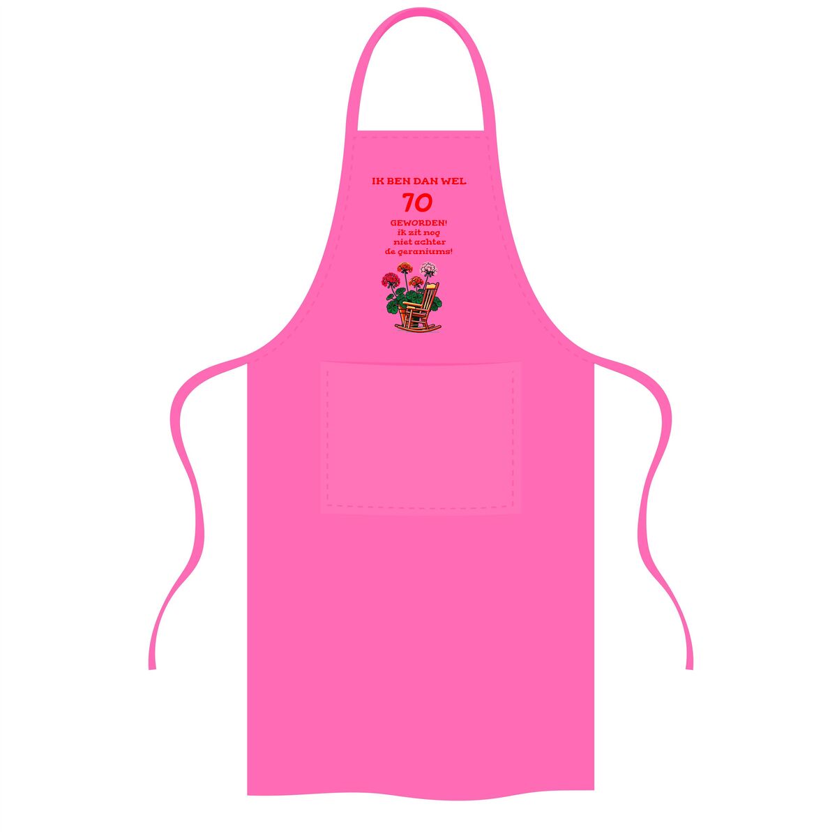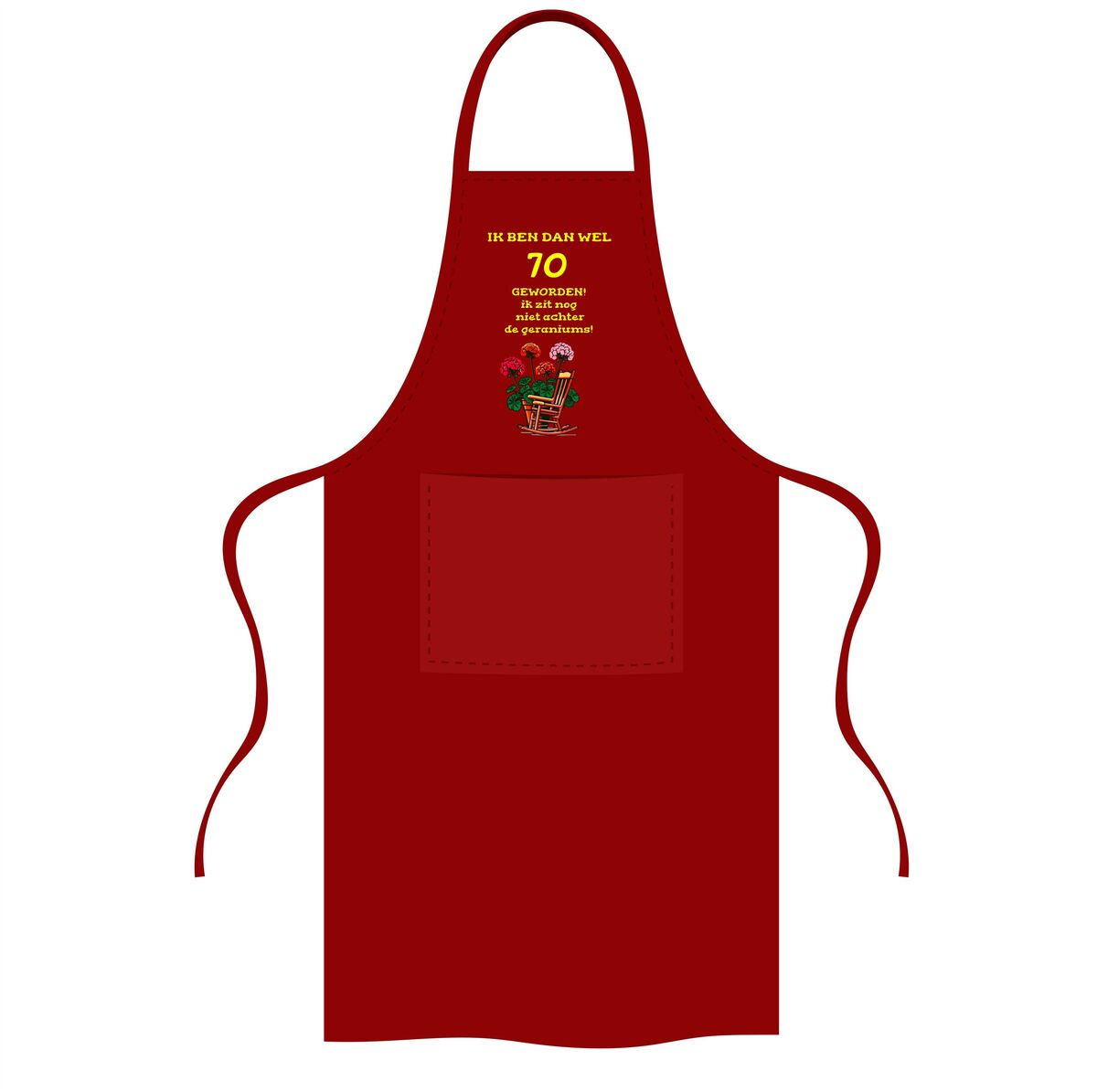 Deze 70ste verjaardag schort is een origineel en grappig cadeau voor vader, moeder, opa of oma die 70 jaar wordt en nog lang niet van plan is om achter de geraniums te verdwijnen. Tijdens een verjaardagsfeest, familiediner of tuinfeest zorgt dit keukenschort gegarandeerd voor lachende gezichten en leuke gesprekken. De opvallende tekst maakt het schort niet alleen praktisch, maar ook een echte blikvanger.
