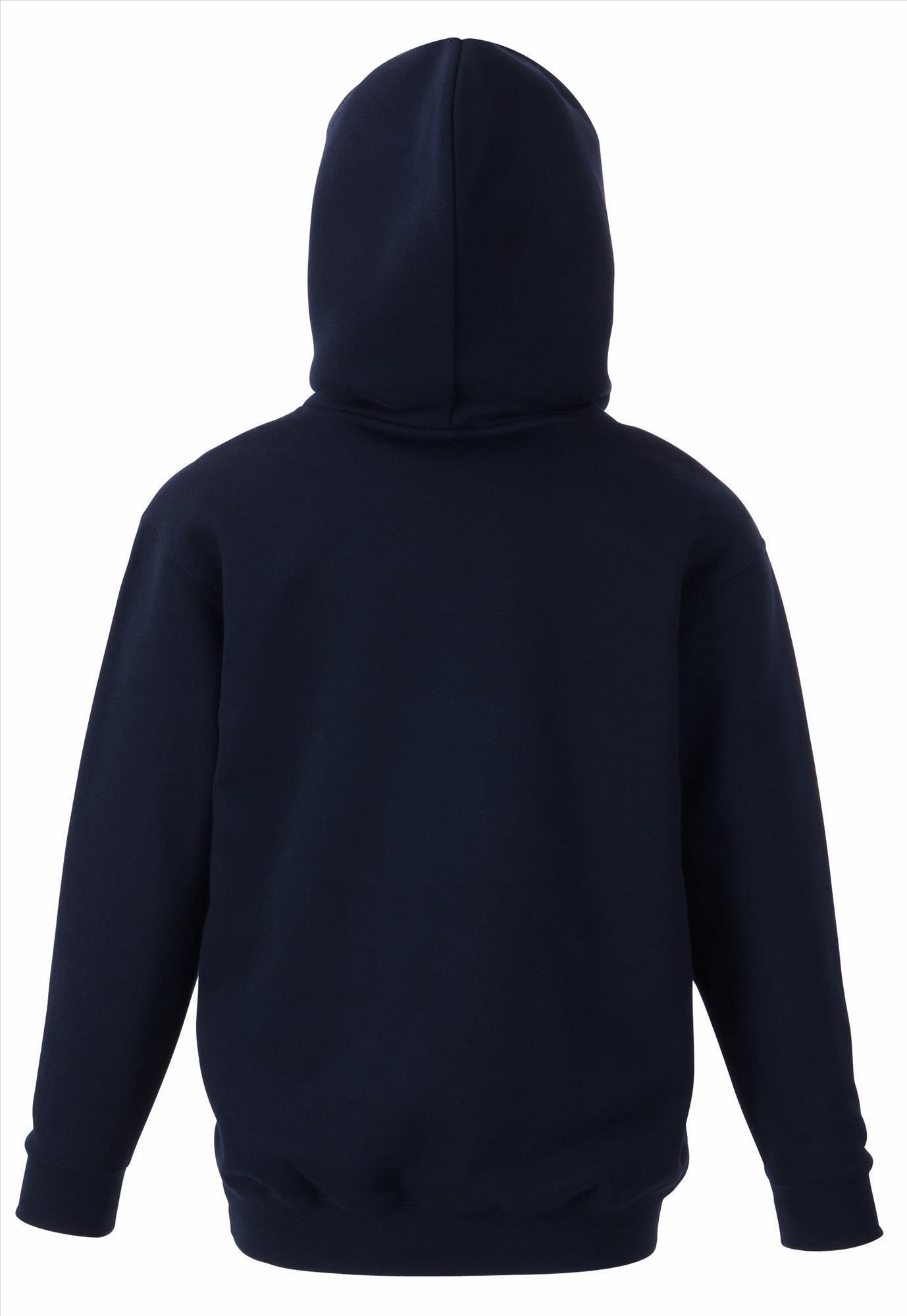Donkerblauwe Kinder sweater met gevoerde capuchon zonder koord. Basic hooded sweat voor kinderen, hierin kunnen ze heerlijk spelen en sporten. Het is een prima vrijetijds hoodie. Materiaal:80% Cotton - 20% Polyester. Merk: Fruit of loom. Land van herkomst:Morocco. Foto met meisje erop is ter illustratie kleur buiten beschouwing houden.