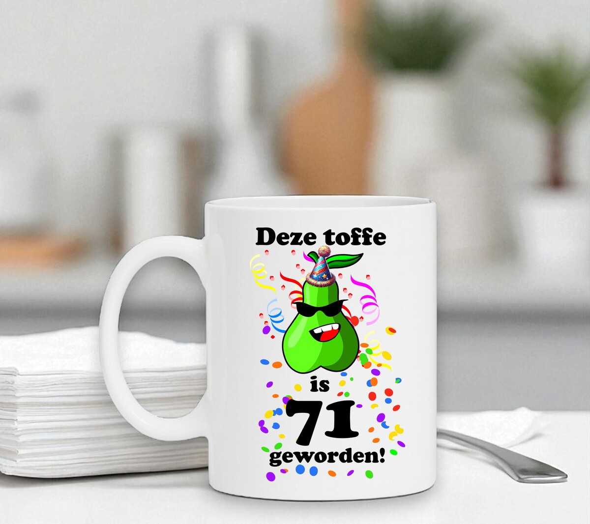Deze leuke mok met grappige tekst en print is een tof cadeau voor een toffe peer die 71 jaar wordt.