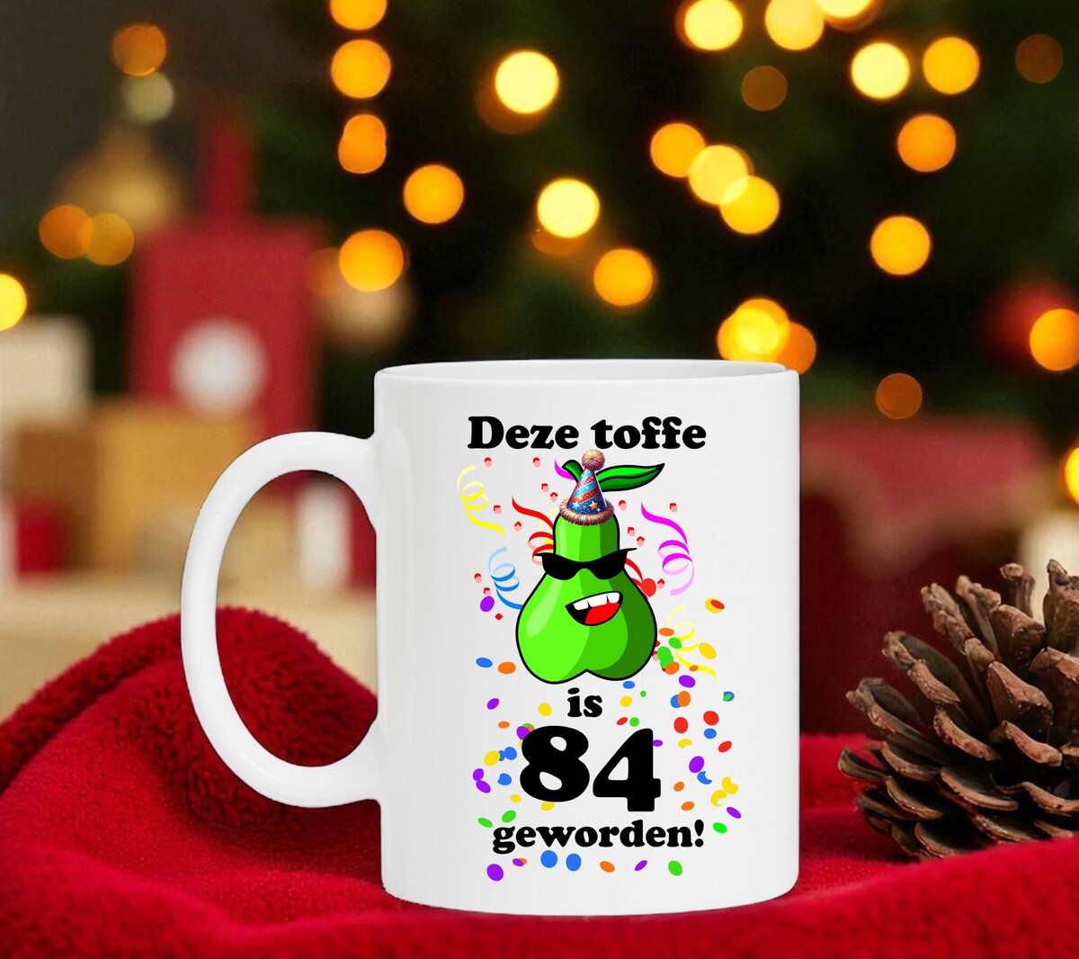 Op deze mok staat de grappige print en tekst: Deze toffe peer is 84 geworden.
