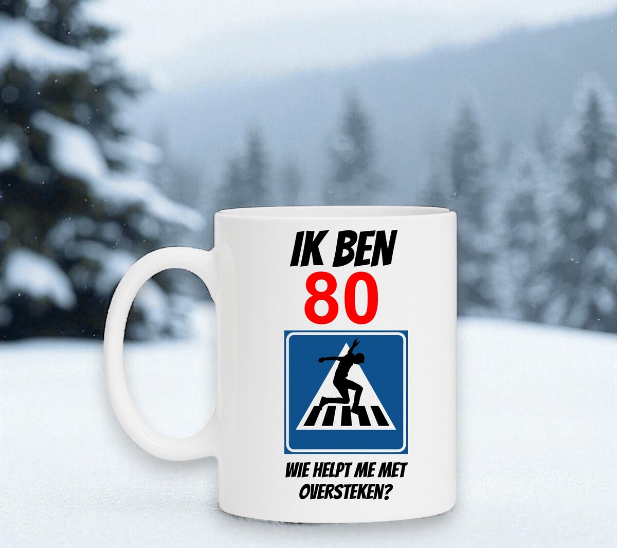 Op deze mok staat de leuke tekst: ik ben 80 wie helpt me oversteken? Deze mok is full colour bedrukt.