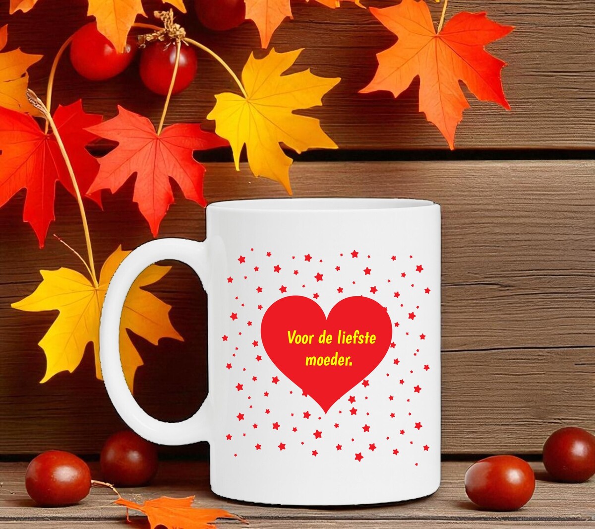 Een prachtige en lieve koffie of thee mok voor een hele lieve moeder. Op de koffiemok staat een groot rood hart gedrukt met de tekst in gele letters voor de liefste moeder.