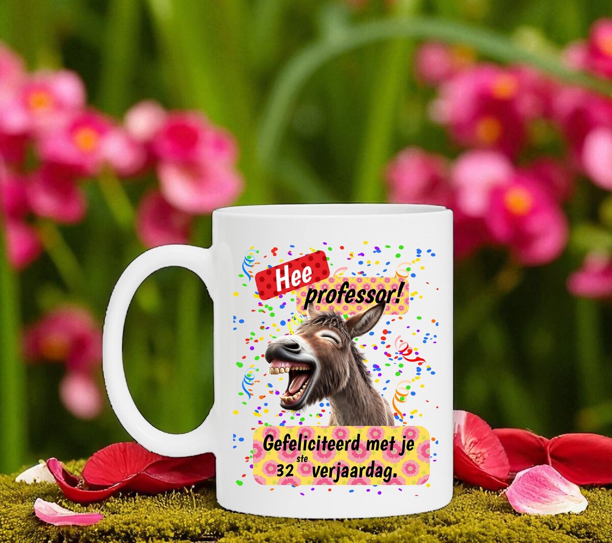 Een super grappig en leuk koffiemok met de opdruk van een ezel en de tekst “Hee professor, gefeliciteerd met je 32ste verjaardag.”