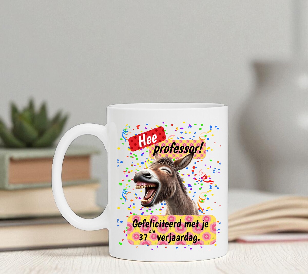 Superleuke en gekke koffiemok leuk om cadeau te geven aan de studiebol van de familie die 37 jaar wordt. Op de koffiemok staat de tekst “Hee professor, gefeliciteerd met je 37ste verjaardag!” Met een superleuke print van een ezel!