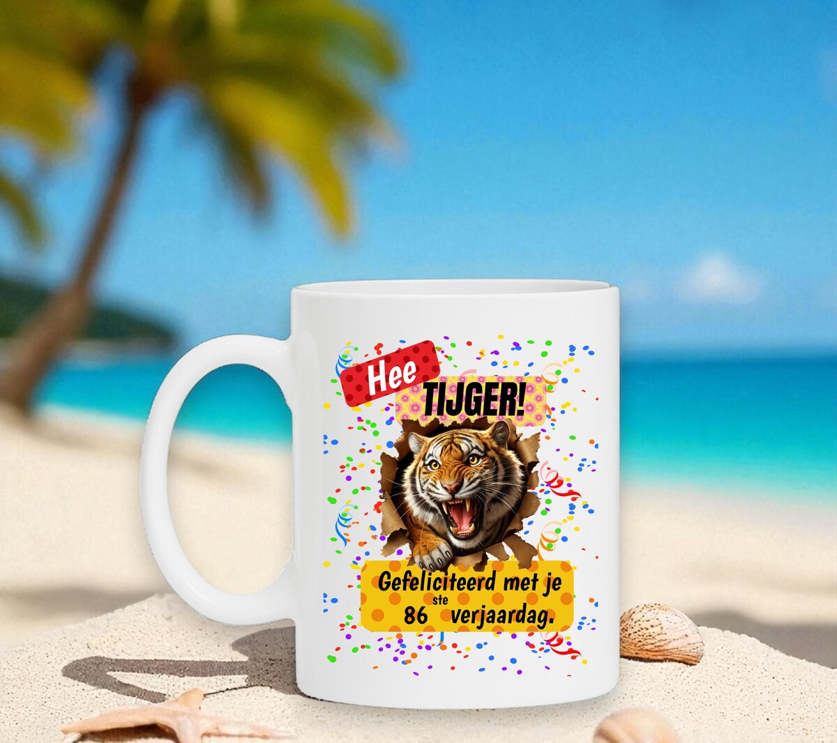 Koffiemok 86ste verjaardag voor een hele stoere opa of een hele stoere oma! Op de koffiemok is een kleurrijke en stoere print afgedrukt met daarop de tekst ‘Hee Tijger, Gefeliciteerd met je 86ste verjaardag’ Ook is op de koffiemok een tijgerkop geprint die uit de koffiemok probeert te kruipen! Echt een stoere koffiemok!