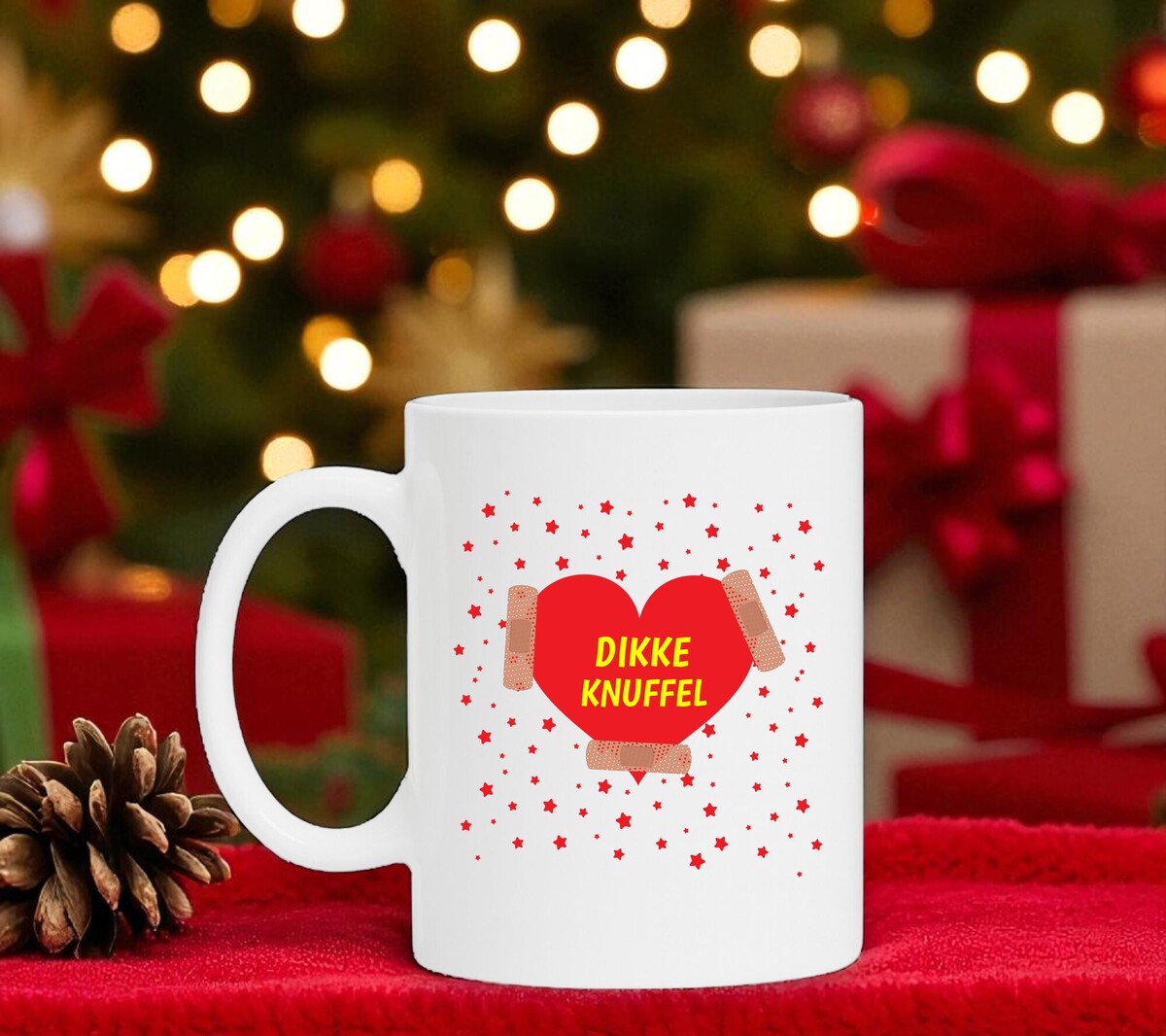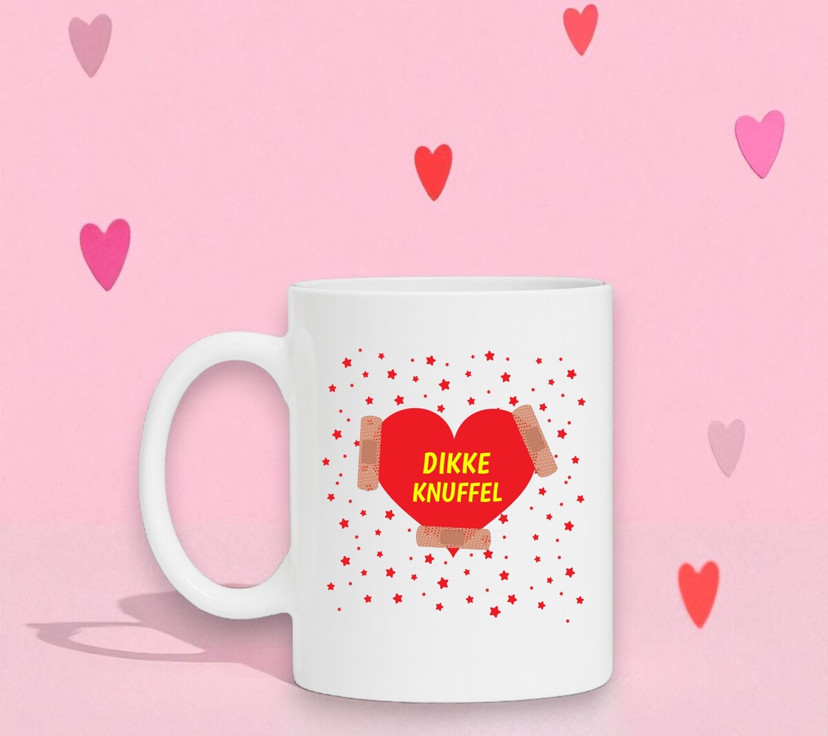 Een leuke beterschap koffiemok om hem of haar beterschap te wensen. Op de koffiemok is met gele letters in een rood hart de tekst ‘Dikke knuffel’ geschreven. Het rode hart is vast gemaakt met pleisters. Als opvulling zijn allemaal rode sterren op de mok gedrukt. Kortom een hele gave beterschap mok’