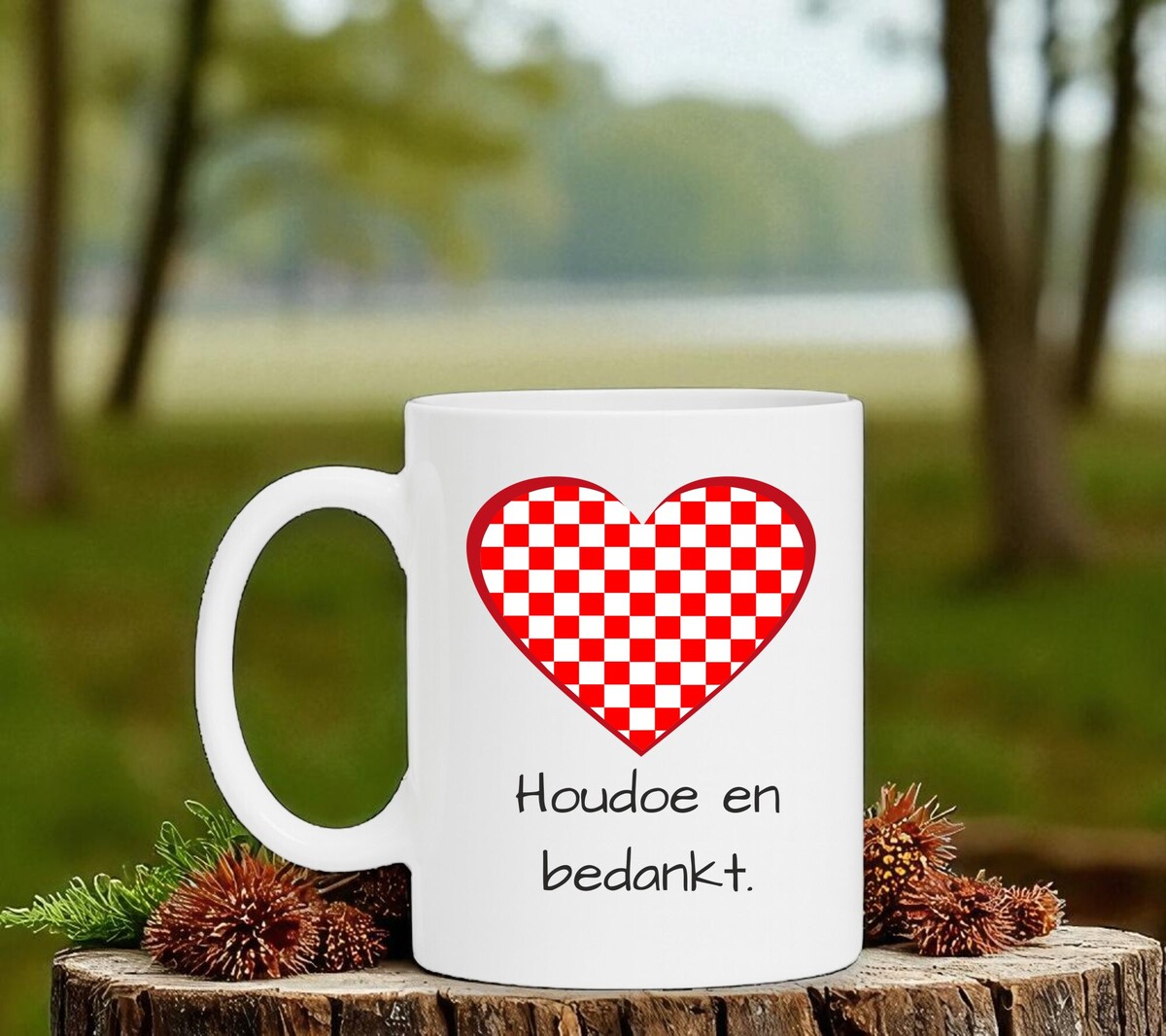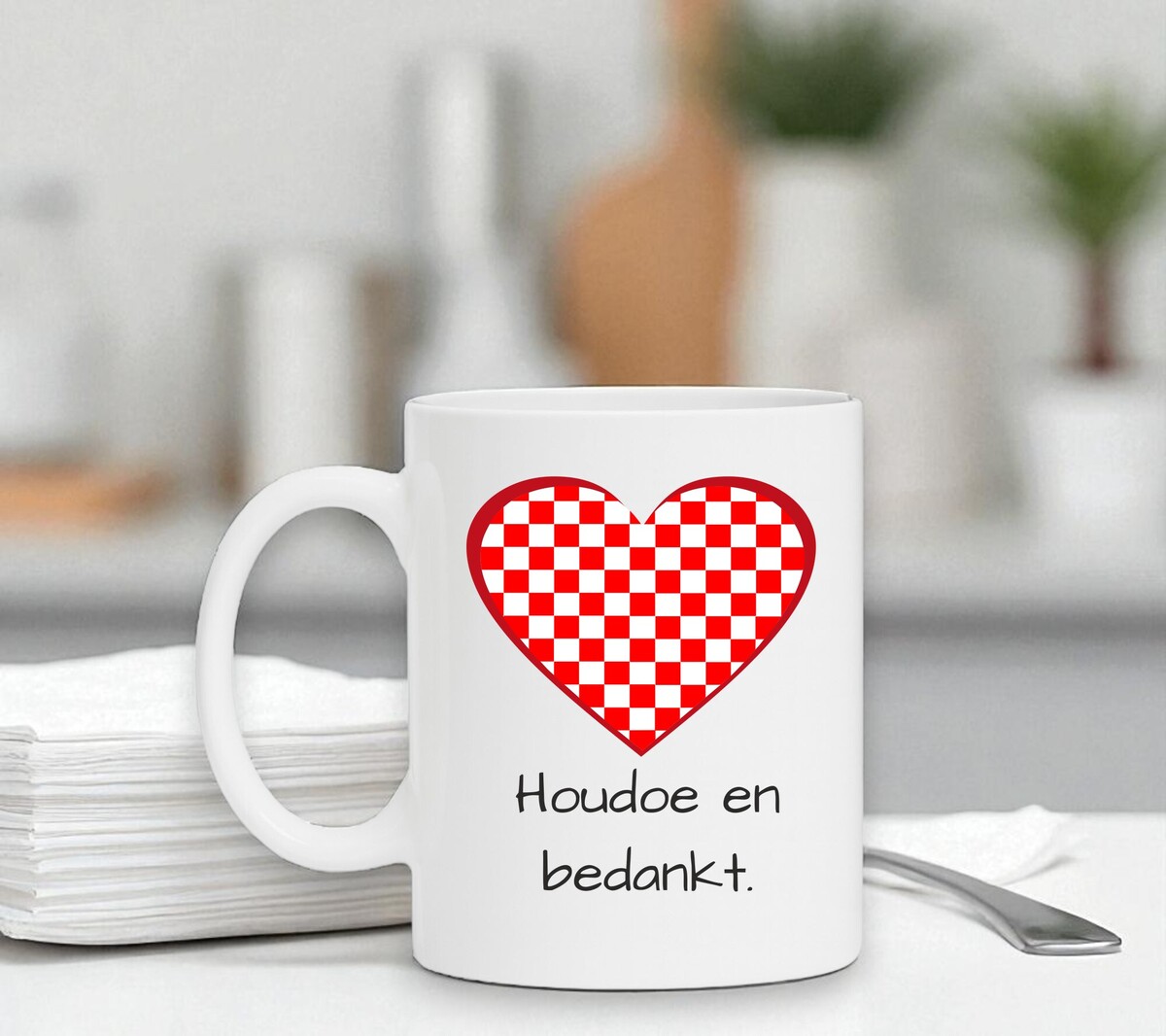 Koffiemok Brabant houden van houdoe en bedankt. De witte koffie of thee mok is vaatwasserbestendig en magnetronbestendig. De mok heeft een hoogte van 96mm en een diameter van 80mm.