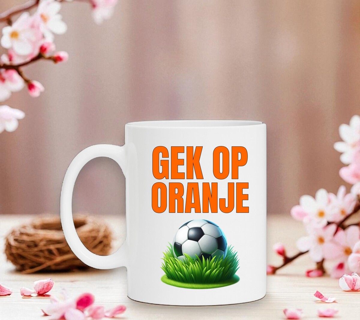 Koffie mok gek op oranje. Voor de echte voetbal oranje fan. De witte koffie of thee mok is vaatwasserbestendig en magnetronbestendig. De mok heeft een hoogte van 96mm en een diameter van 80mm.