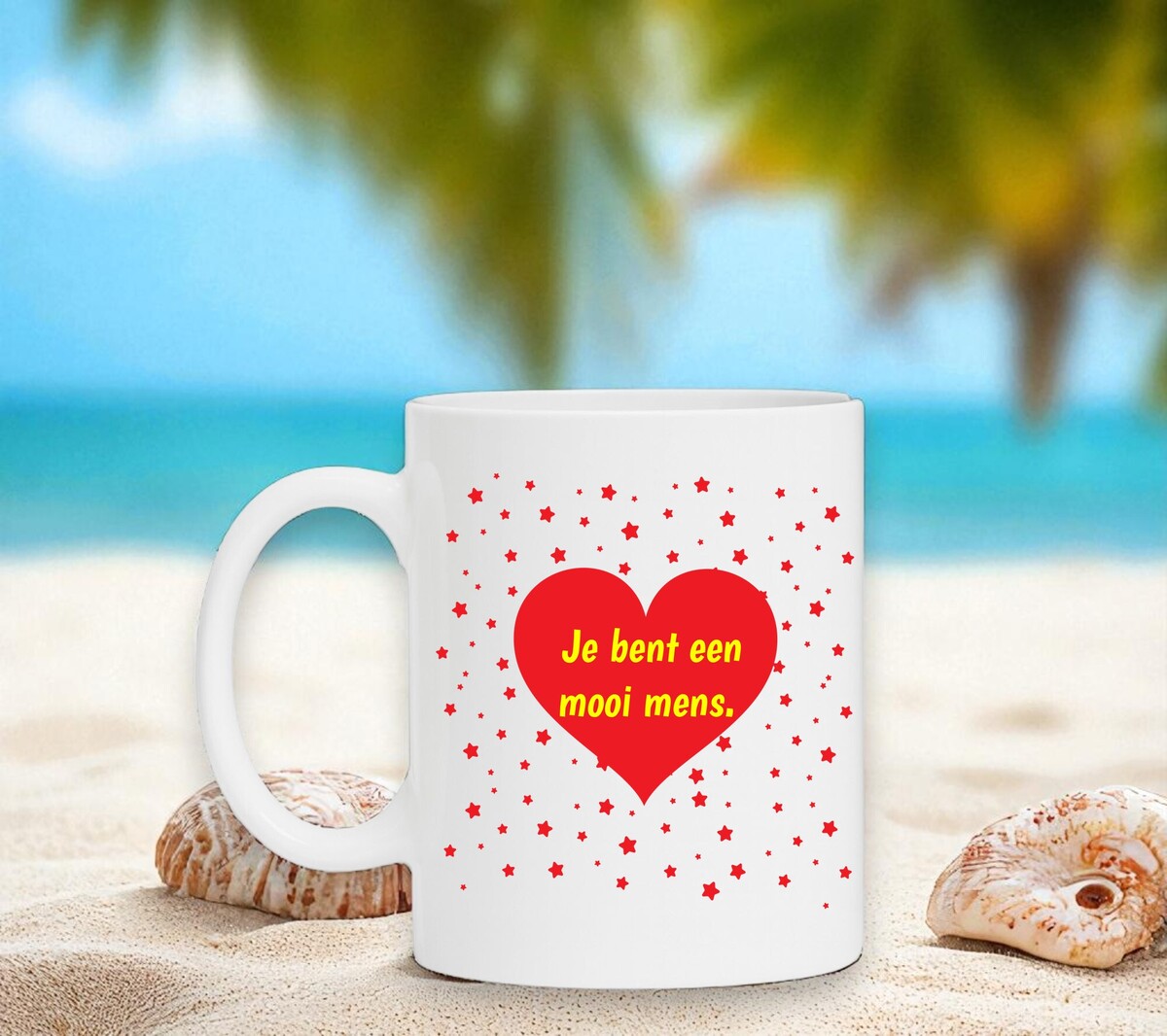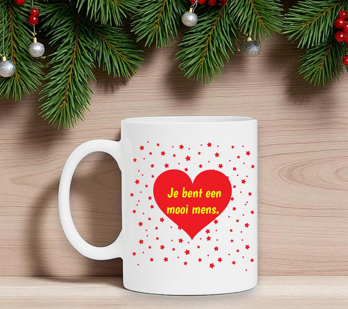 Een leuk koffiemok om hem of haar te bedanken. Op de koffiemok staat de tekst in een rood hart met gele letters ‘Je bent een mooi mens.’