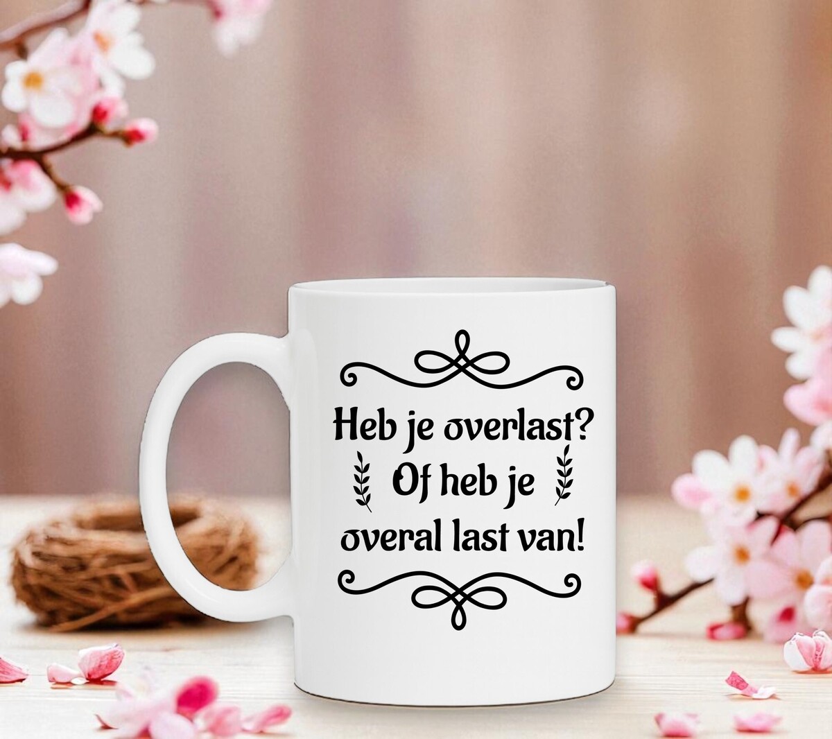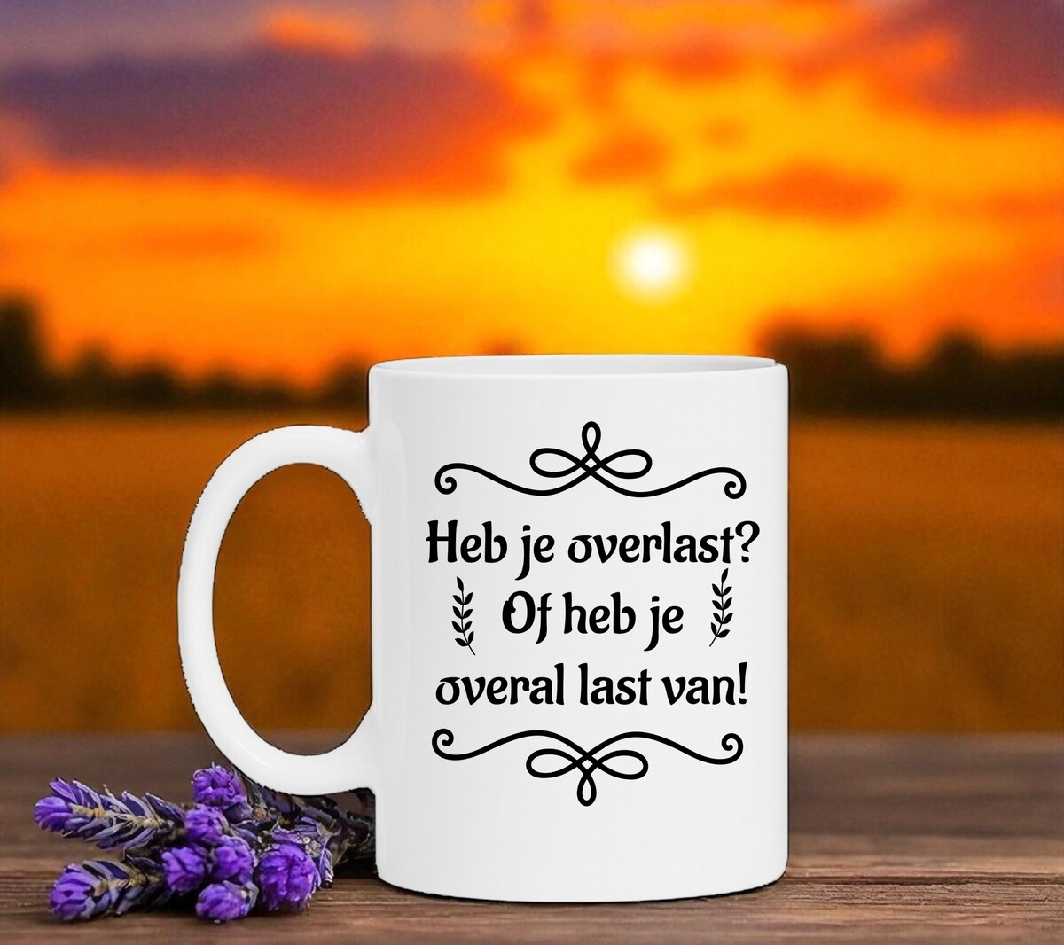 Zet je dag in perspectief met onze humoristische koffiemok! Met de tekst 'Heb je overlast? Of heb je overal last van!' is het de perfecte mok om je collega's of huisgenoten aan het lachen te maken. Een geweldig cadeau voor die ene vriend die wel wat relativering kan gebruiken of gewoon voor jezelf om de dag met een glimlach te starten. Bestel nu en geniet van je koffie of thee met een knipoog! De mok is vaatwasserbestendig en heeft een hoogte van 96mm en een diameter van 80mm.