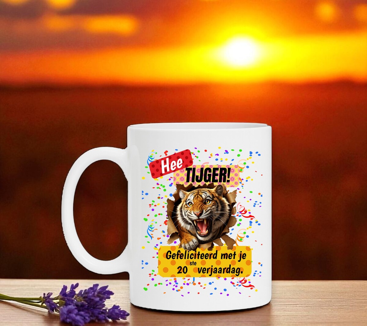 Een stoer cadeau voor hem of haar die 20 jaar wordt! Stop maar met zoeken dit is een echt stoer en origineel cadeau. Op de geweldige koffiemok staat de tekst “Hee tijger, gefeliciteerd met je 20de verjaardag” Op de koffiemok staat een tijger afgedrukt die brullend uit de koffiemok kruipt!