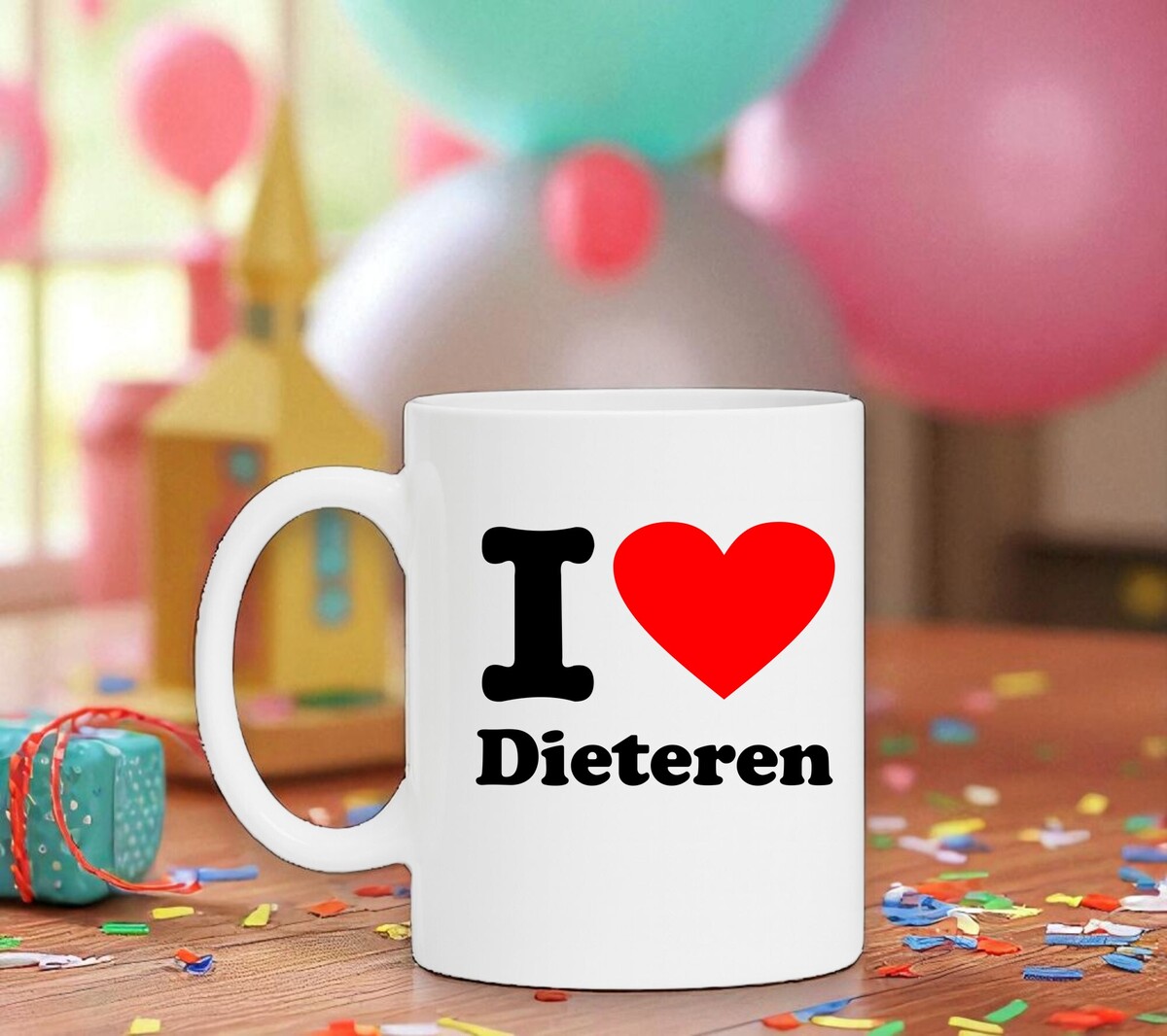 Limburg is een van de mooiste provincie in Nederland. Met zijn mooie natuur maar ook de mooie dorpen en steden. Woon jij in het mooie Dieteren? Dan is deze koffiemok met de tekst: “I love Dieteren” echt iets voor jou. Ook erg leuk om cadeau te doen aan een bewoner van het prachtige dorp Dieteren. Dieteren is een kerkdorp in de zogenaamde 'taille' van de Nederlandse provincie Limburg, gelegen tussen de kernen Roosteren en Susteren, in de gemeente Echt-Susteren.