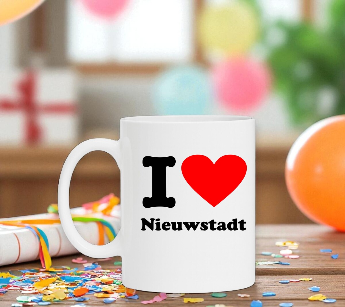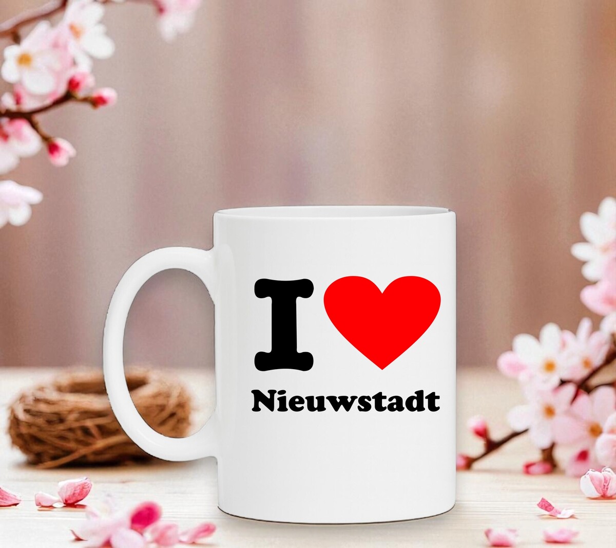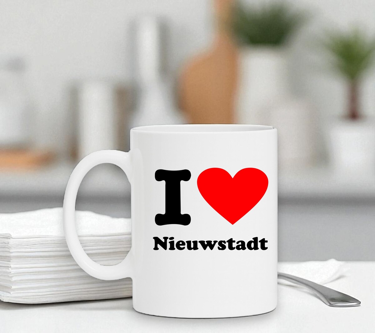 Een prachtige koffiemok voor als jij apetrots bent dat je in het mooie Nieuwstadt mag wonen. Op de koffiemok staat de tekst: “I love Nieuwstadt” Nieuwstadt is een stadje in het midden van Nederlands-Limburg. De plaats ontving in de 13e eeuw stadsrechten en kan dus historisch worden gezien als een stad.