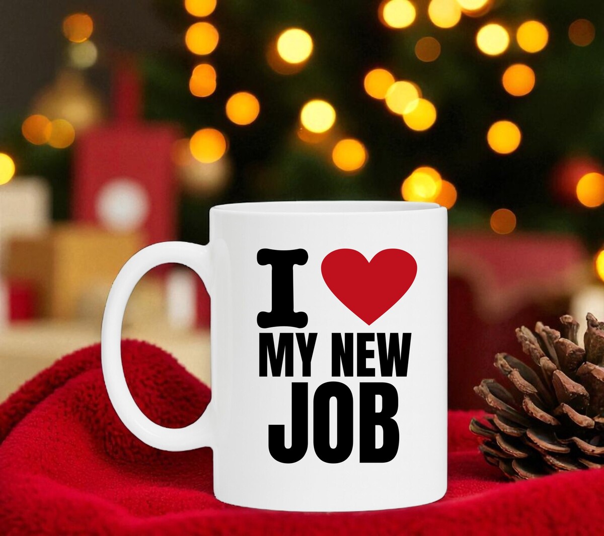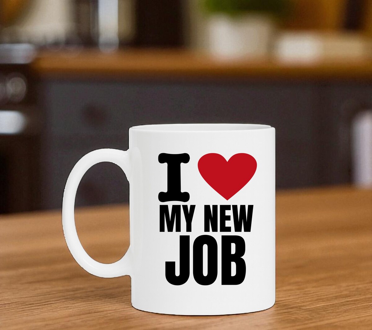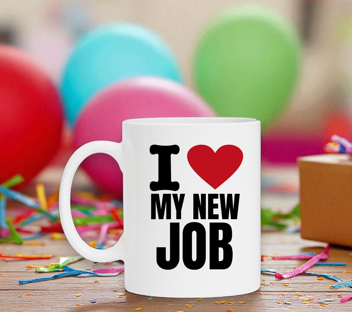 Koffiemok i love my new job ik hou van mijn nieuwe baan. De witte koffie of thee mok is vaatwasserbestendig en magnetronbestendig. De mok heeft een hoogte van 96mm en een diameter van 80mm.