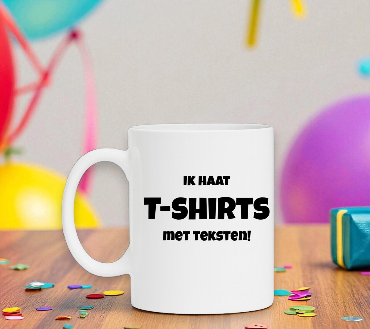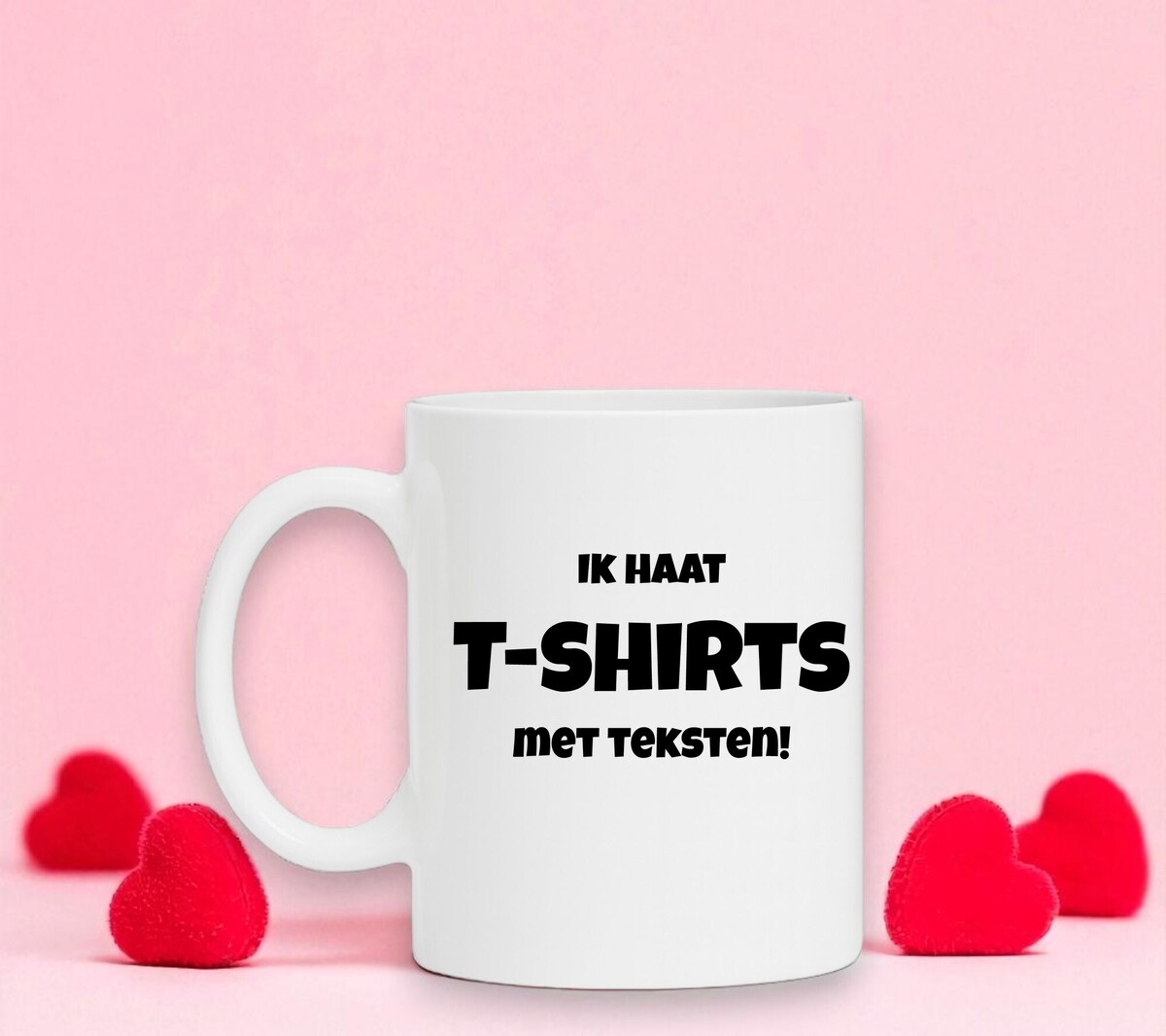 Een grappige koffiemok met de tekst 'Ik haat T-shirts met teksten'. Een koffiemok met een knipoog.