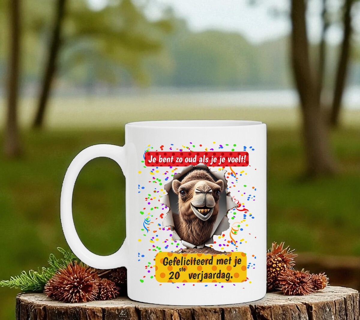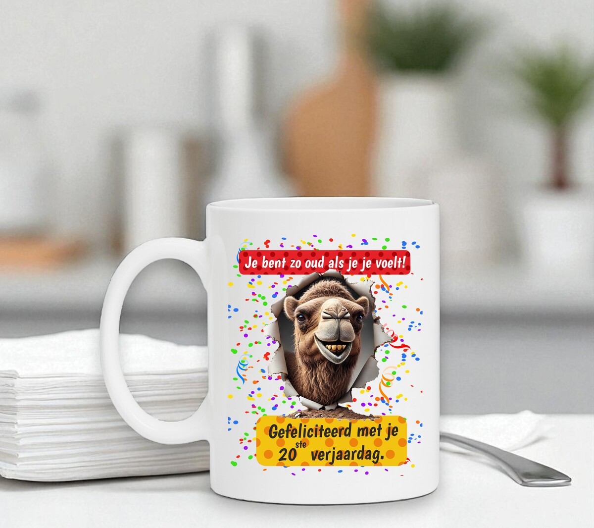 Op zoek naar een leuk cadeau voor iemand die 20 jaar wordt en altijd loopt te klagen? Dan is deze koffiemok bij uitstek geschikt. De koffiemok is voorzien van een drommedaris met niet zo’n hele frisse snoet. Daarboven staat de tekst ‘Je bent zo oud als je je voelt’. Onder de drommedaris staat de tekst ‘gefeliciteerd met je 20ste verjaardag’