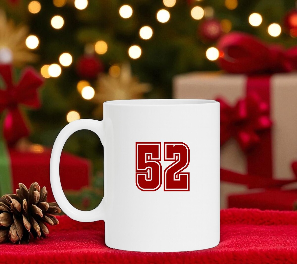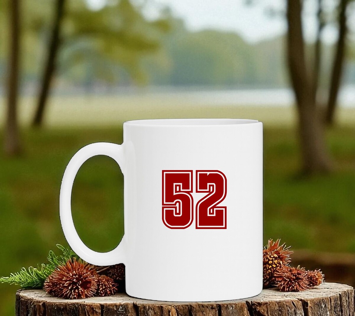 Koffiemok met cijfer 52 in de kleur robijnrood. Hoogte 9cm hoog.