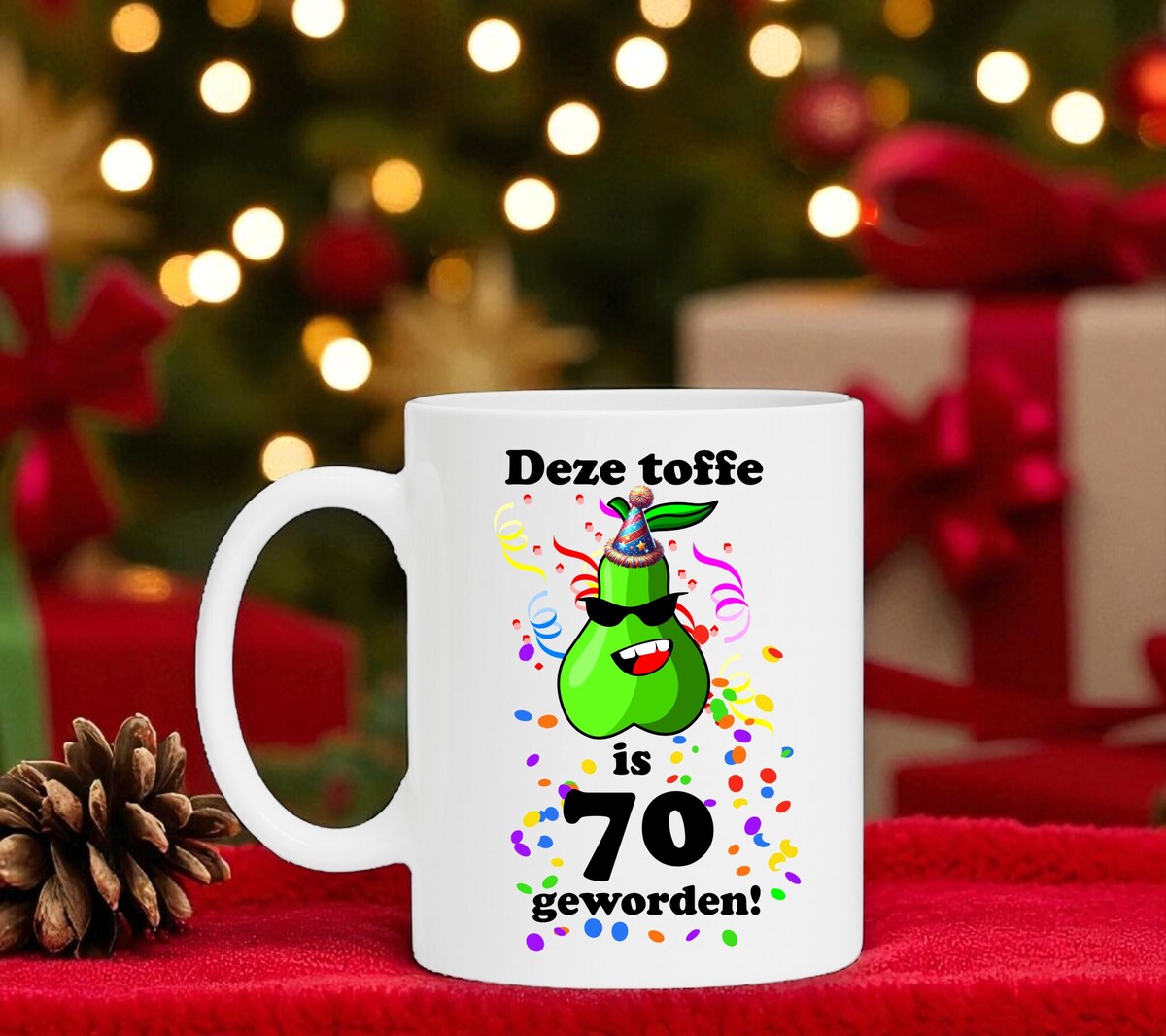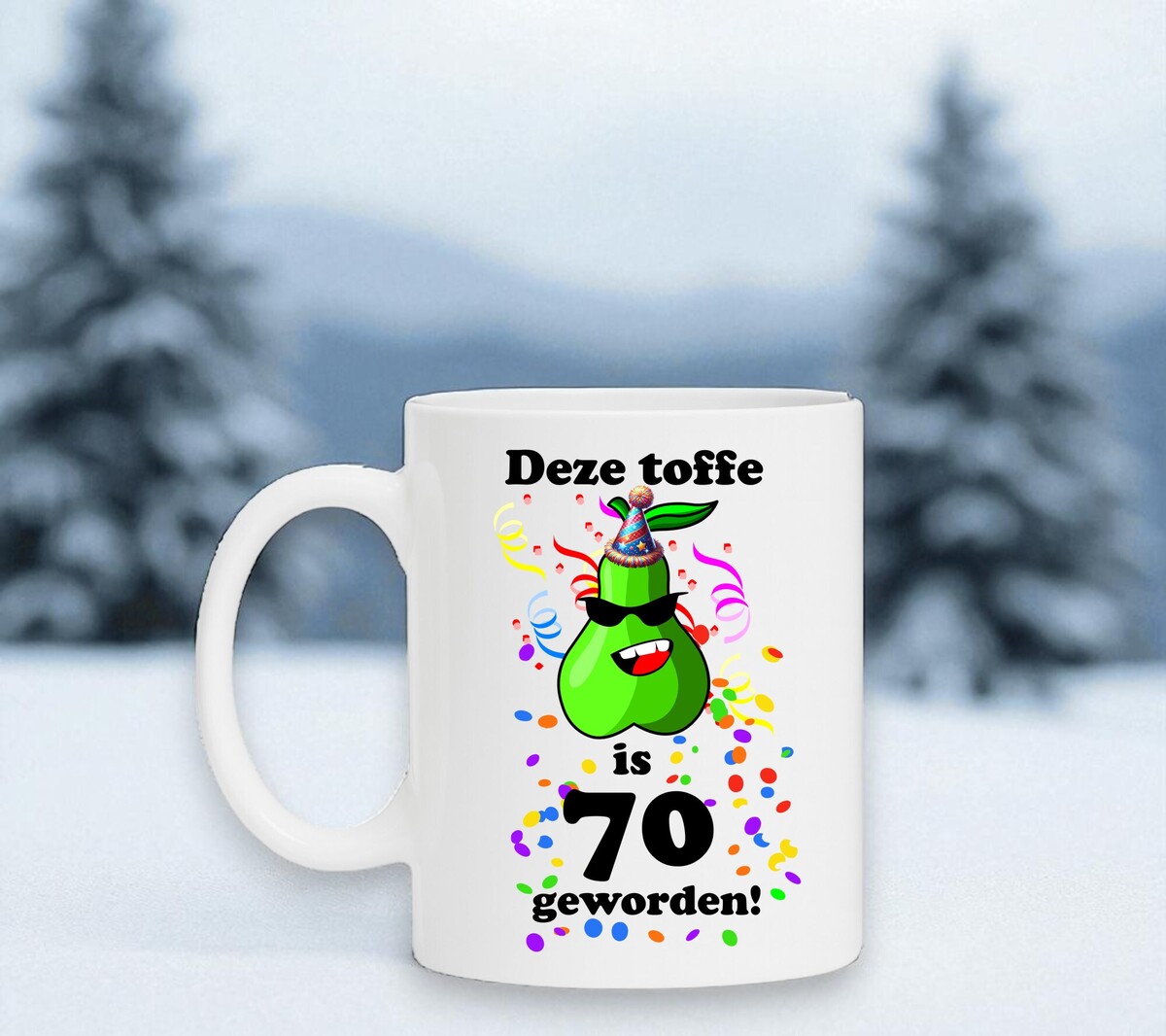 Deze leuke verjaardag mok is een geschikt cadeau voor een verjaardag van zeventig jaar. Op deze mok staat de tekst en print: Deze toffe peer is 70 geworden.