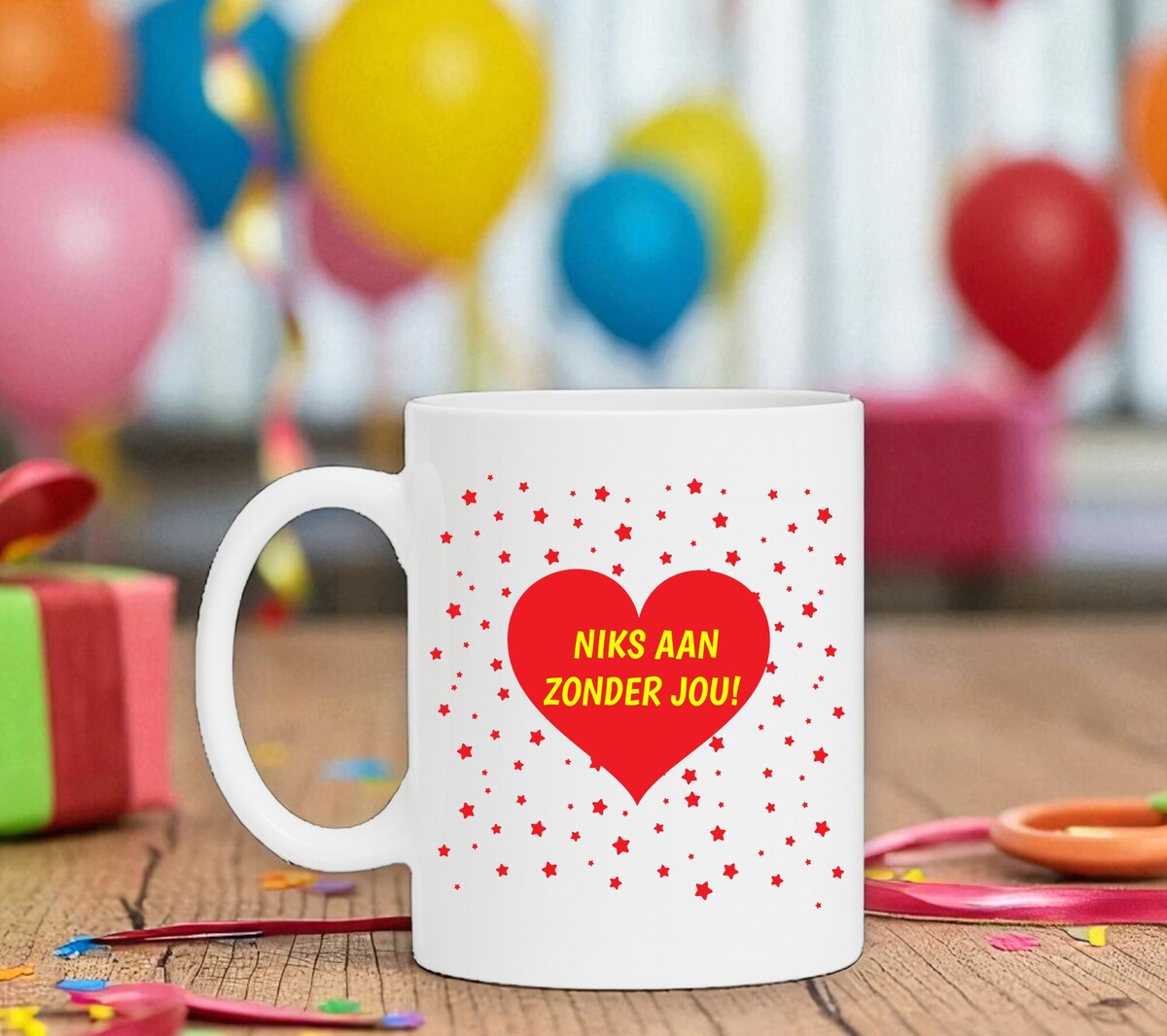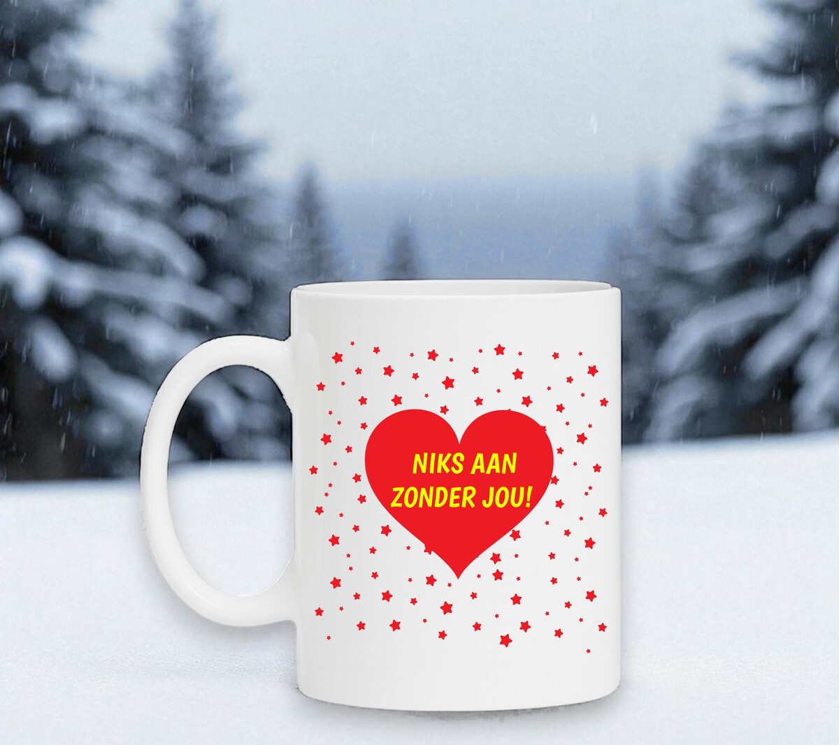 Koffiemok niks aan zonder jou! Voorzien van een groot rood hart met daarin in gele letters de tekst ingeschreven!