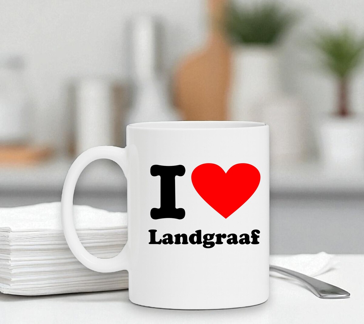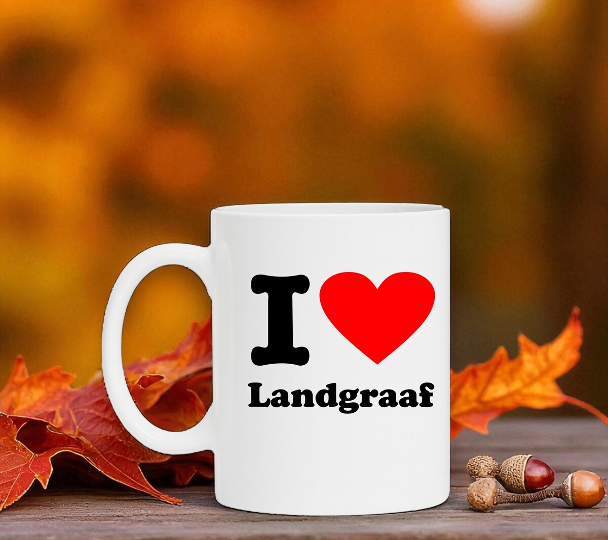 Koffiemok om cadeau te doen of zelf te hebben als je helemaal weg bent van jouw stad Landgraaf. Op de koffiemok staat de tekst: “I love Landgraaf”. Landgraaf is een stad en gemeente in het zuiden van Limburg.