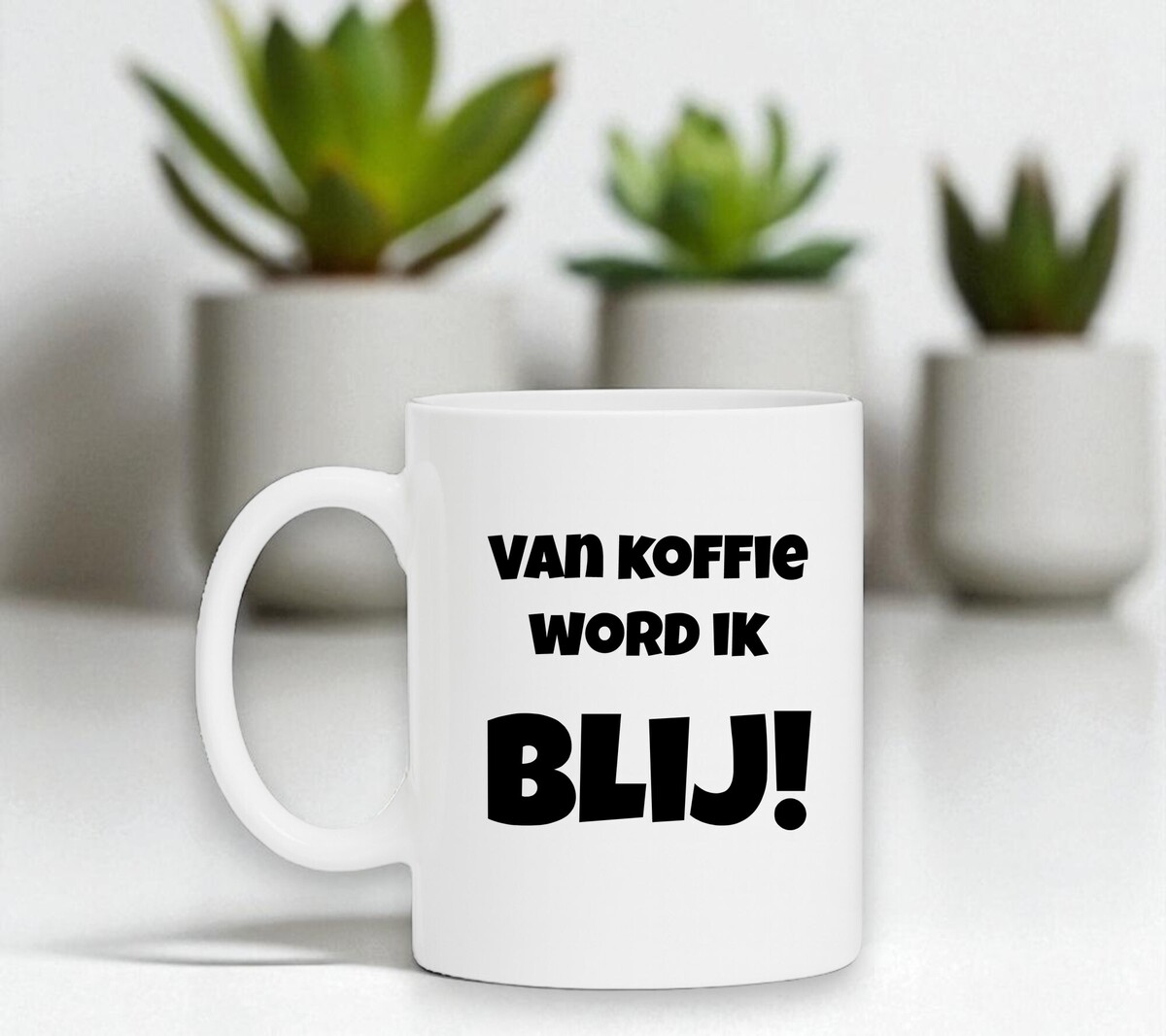 Een leuke witte koffiemok met de zwarte tekst in een vrolijk lettertype: Van koffie word ik blij