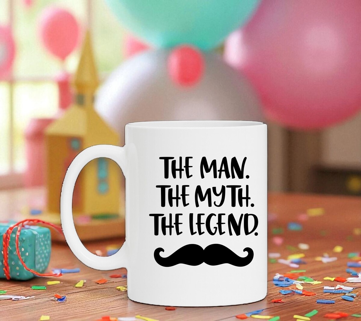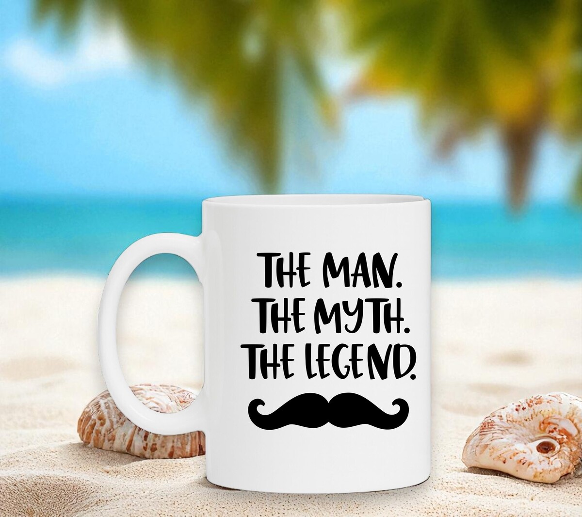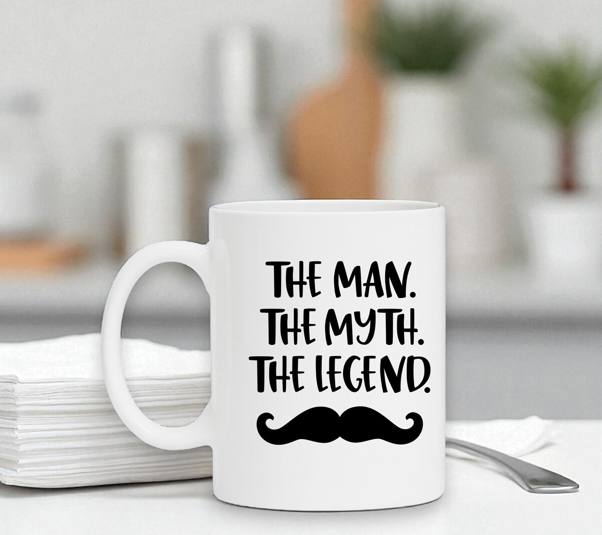 Koffiemok voor Vaderdag The man, The myth, the legend. De mok is vaatwasserbestendig en magnetronbestendig en heeft een hoogte van 96mm en een diameter van 80mm.