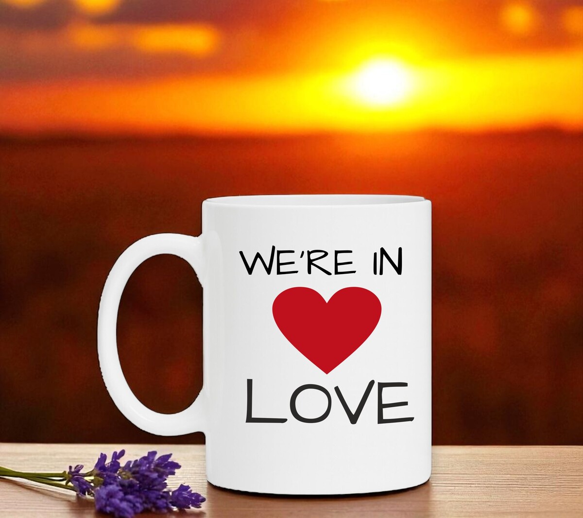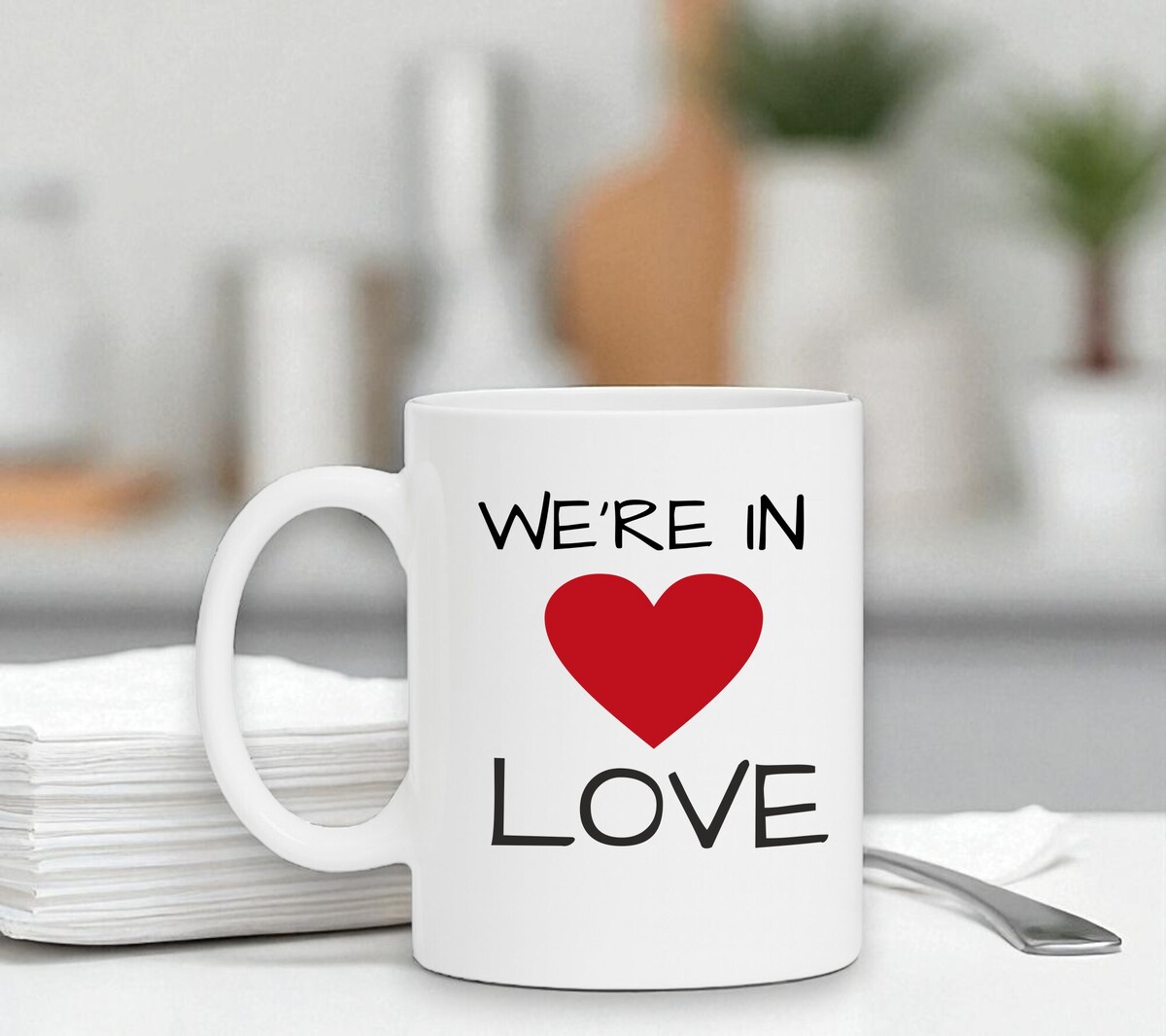 Koffiemok we're in love verliefd valentijn. De witte koffie of thee mok is vaatwasserbestendig en magnetronbestendig. De mok heeft een hoogte van 96mm en een diameter van 80mm.