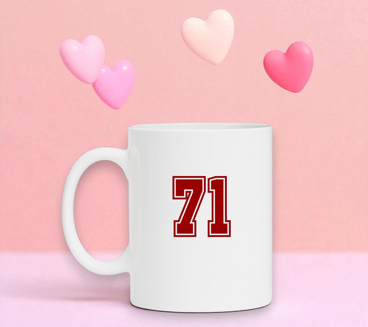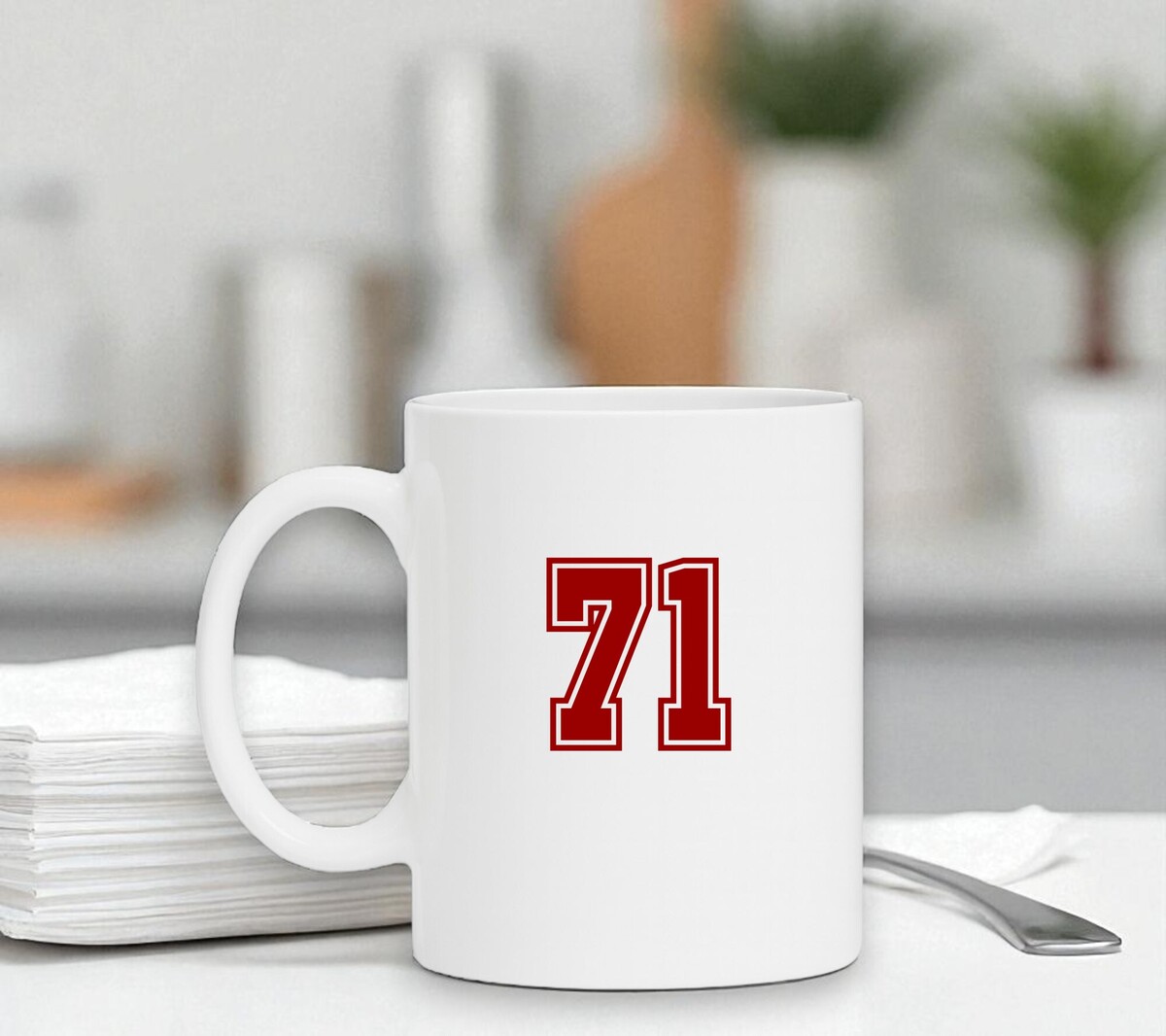 Koffiemok wit met getal 71 in de kleur robijnrood.