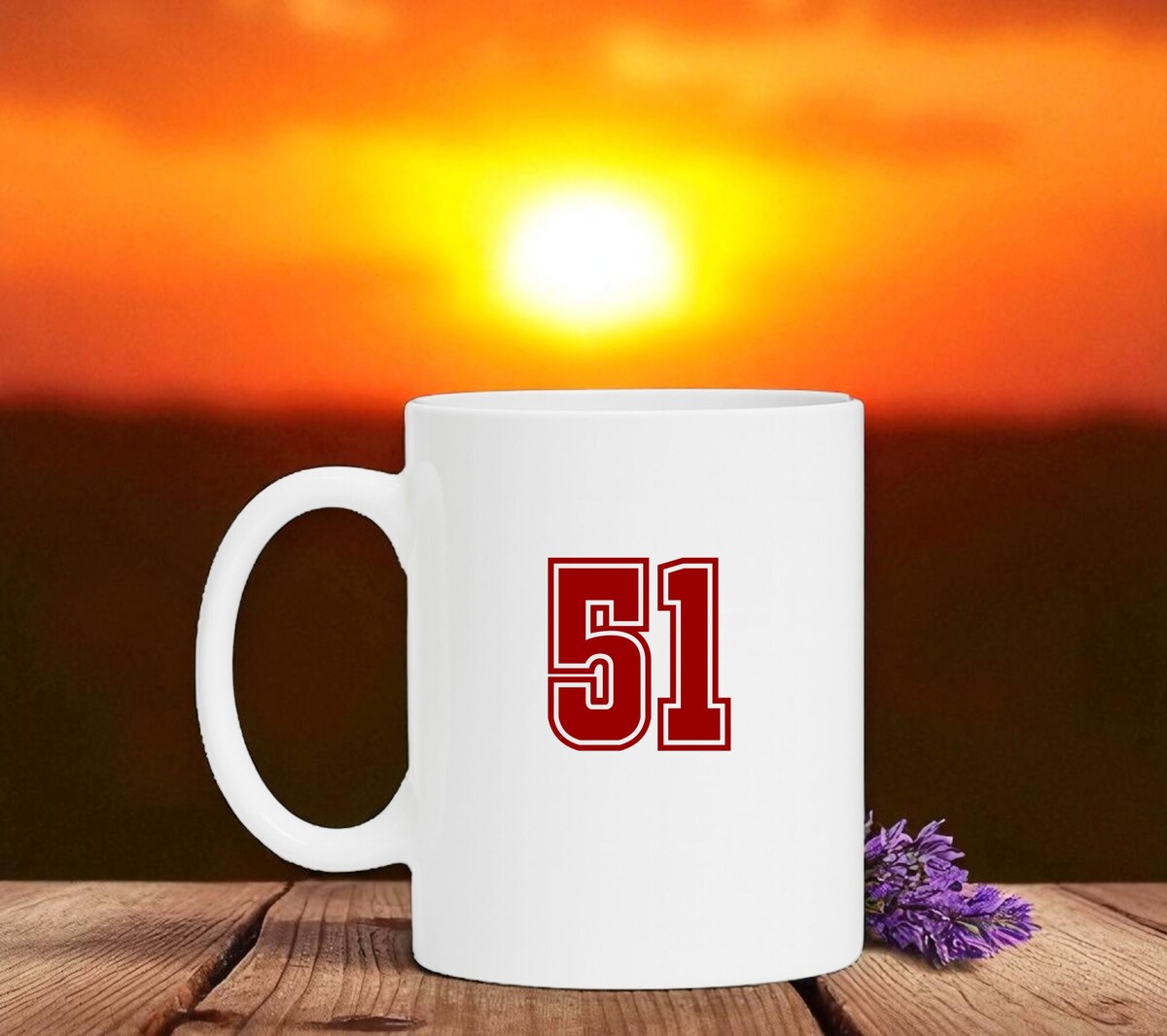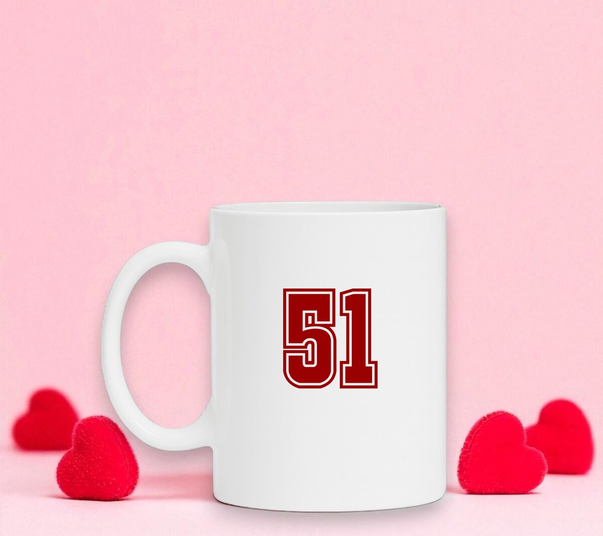 Koffiemok wit met het getal 51 als opdruk in de kleur robijnrood. Hoogte van de mok is 9cm.