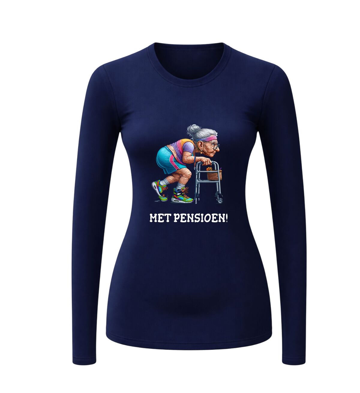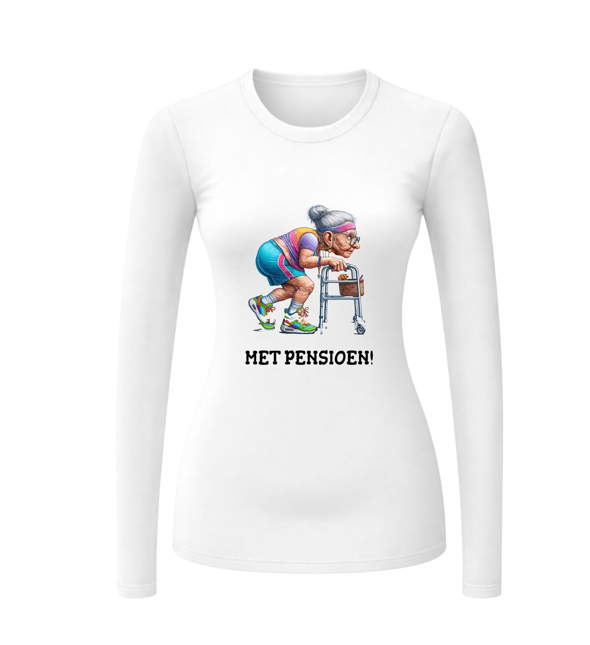 Dit lange mouwen T-shirt voor dames met de tekst Met pensioen is een vrolijk en comfortabel kledingstuk dat perfect past bij het vieren van het pensioen. Met pensioen gaan is een bijzonder moment en dit pensioen shirt laat op een humoristische manier zien dat het werkende leven achter je ligt. De grappige afbeelding van een oude dame met rollator zorgt voor een speels karakter en maakt dit Met pensioen T-shirt direct herkenbaar voor iedereen die het pensioen met een glimlach wil dragen.