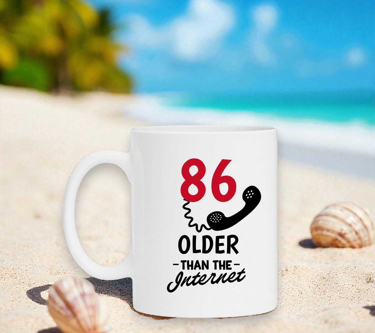 Een leuke leeftijd mok voor hem of haar die 86 jaar wordt en ouder is dan het internet! De witte koffie of thee mok is vaatwasserbestendig en magnetronbestendig. De mok heeft een hoogte van 96mm en een diameter van 80mm.