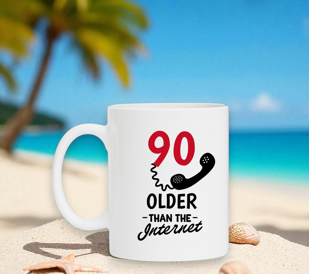 Leeftijd mok voor een 90 jarige met de grappige tekst ouder dan het internet! De witte koffie of thee mok is vaatwasserbestendig en magnetronbestendig. De mok heeft een hoogte van 96mm en een diameter van 80mm.