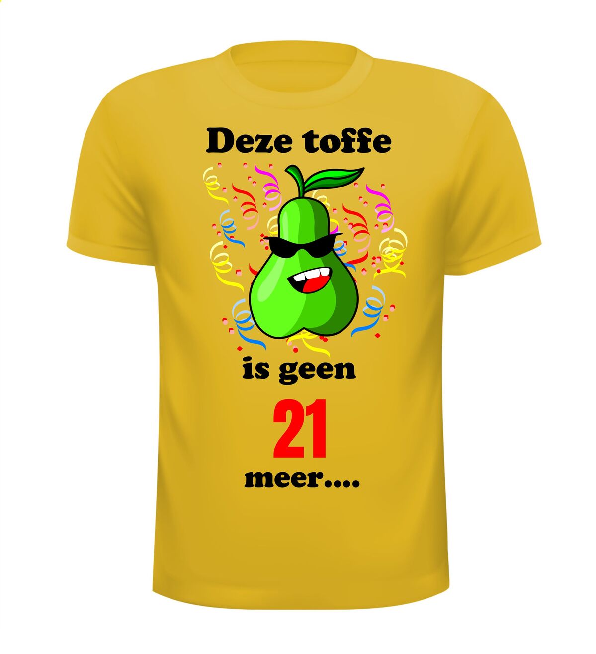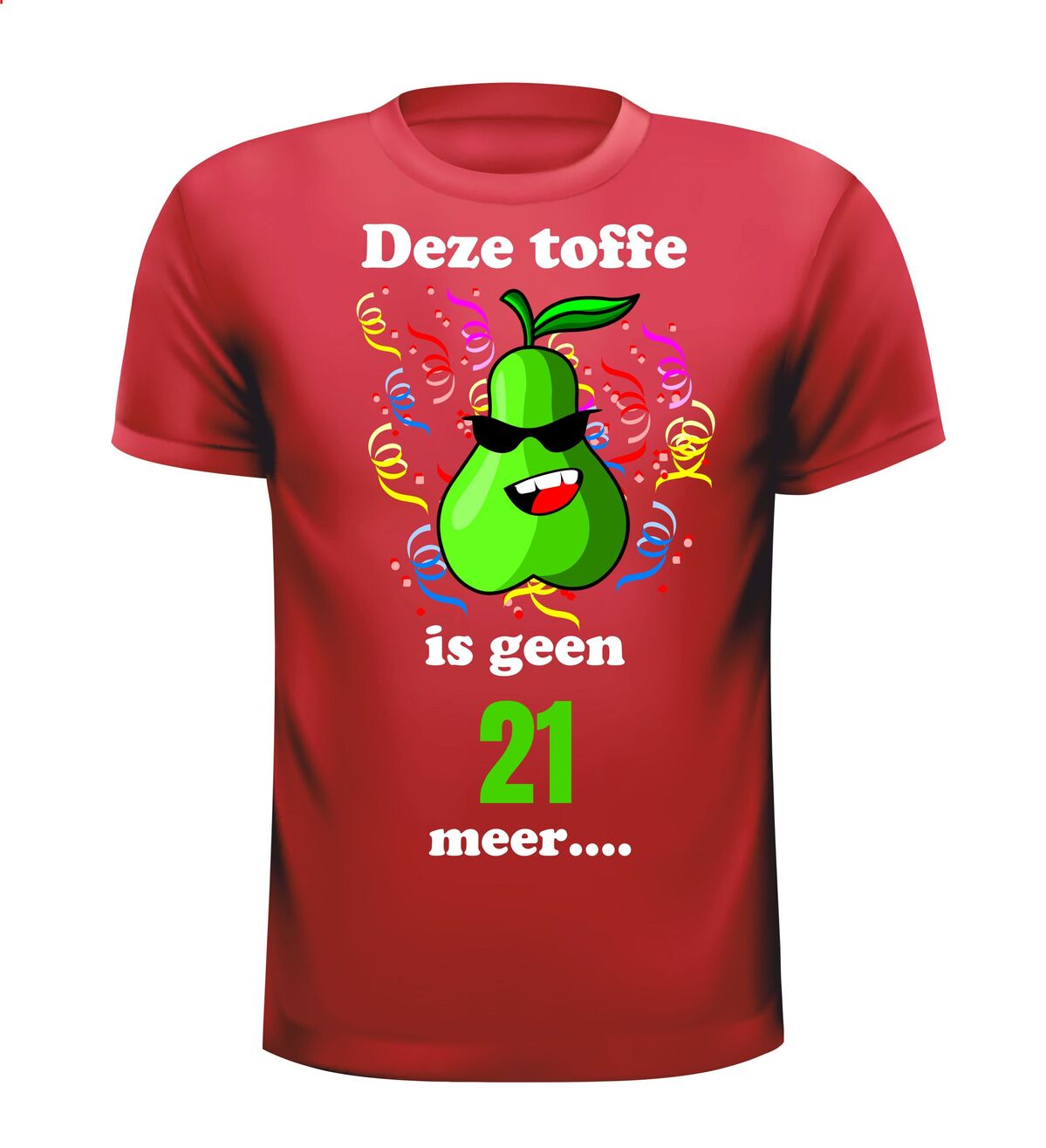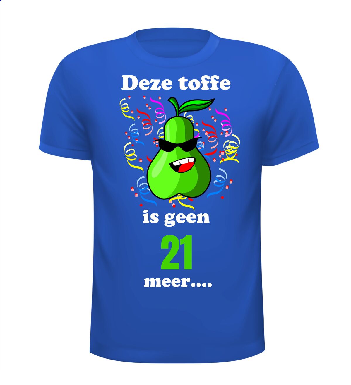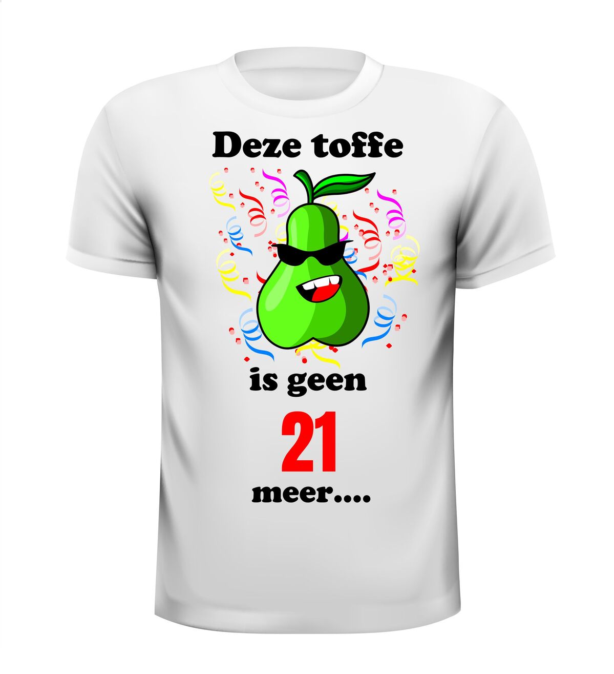 Fun shirt met de tekst: deze toffe peer is geen 21 meer. Leuk om kado te doen voor een 22e verjaardag. Met dit mooie full colour shirt staat de 22 jarige de gehele dag nog extra in het middelpunt van de belangstelling op zijn of haar verjaardag.