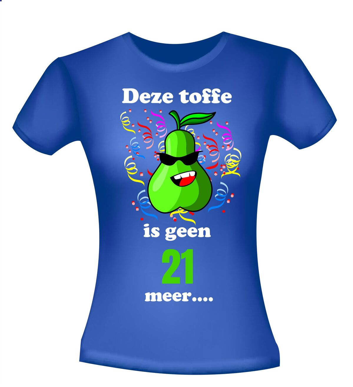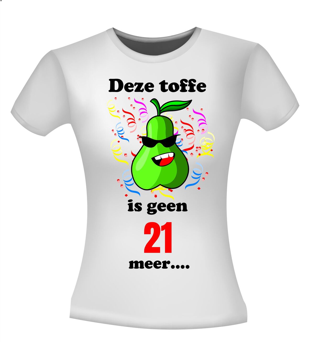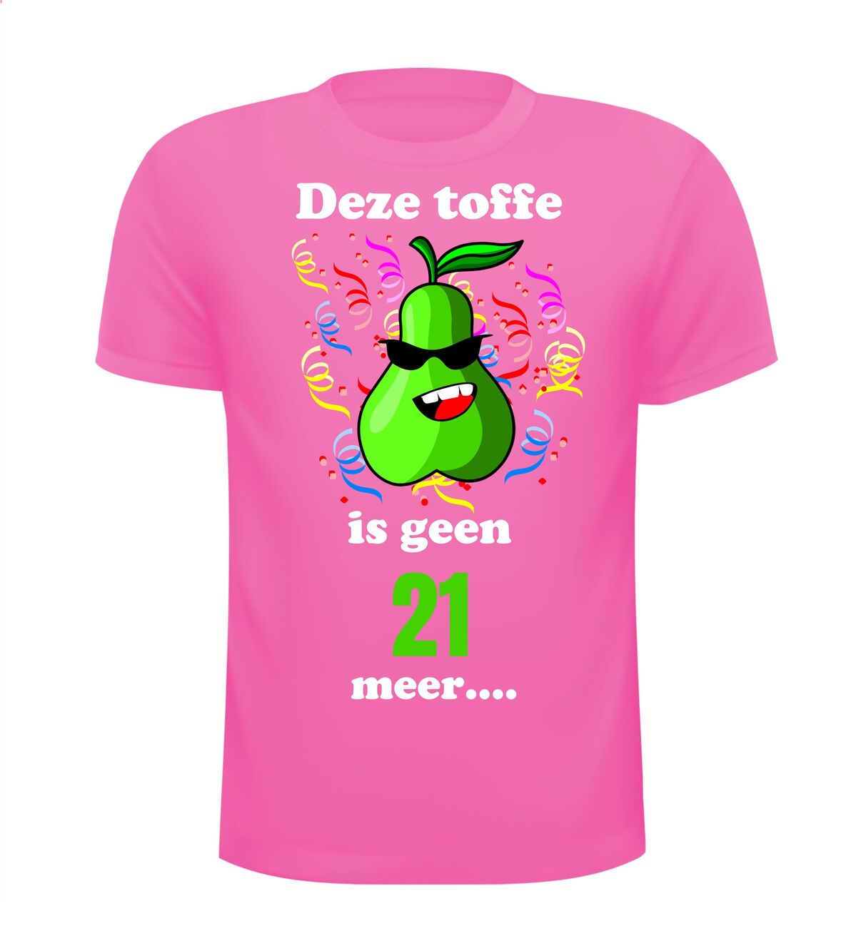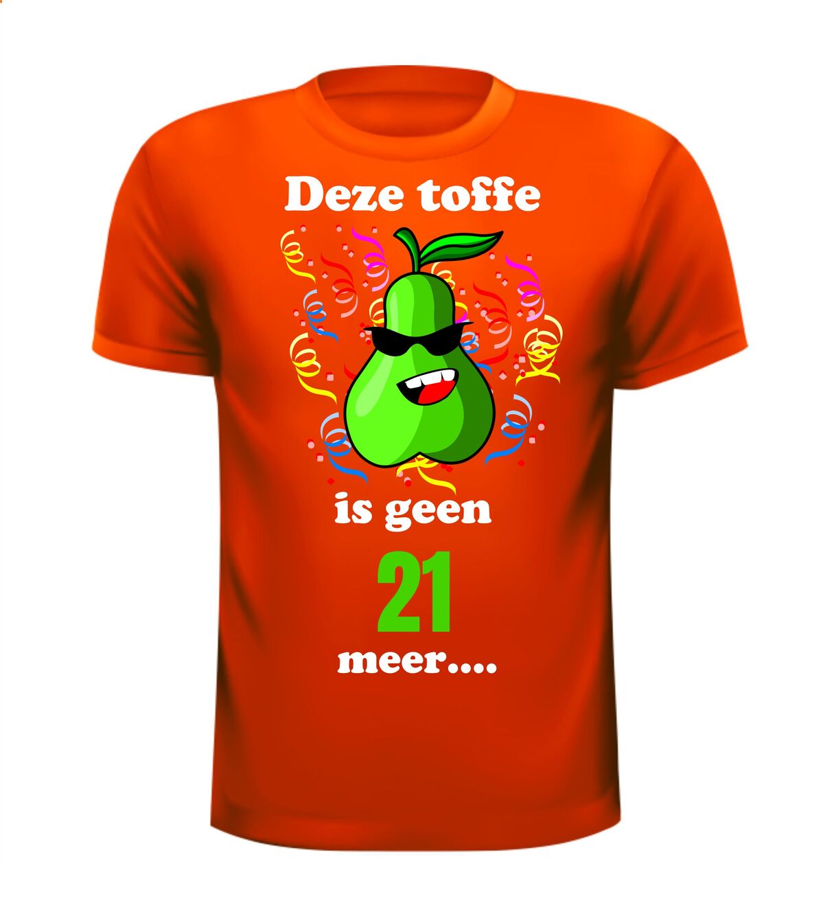 Fun shirt met de tekst: deze toffe peer is geen 21 meer. Leuk om kado te doen voor een 22e verjaardag. Met dit mooie full colour shirt staat de 22 jarige de gehele dag nog extra in het middelpunt van de belangstelling op zijn of haar verjaardag.