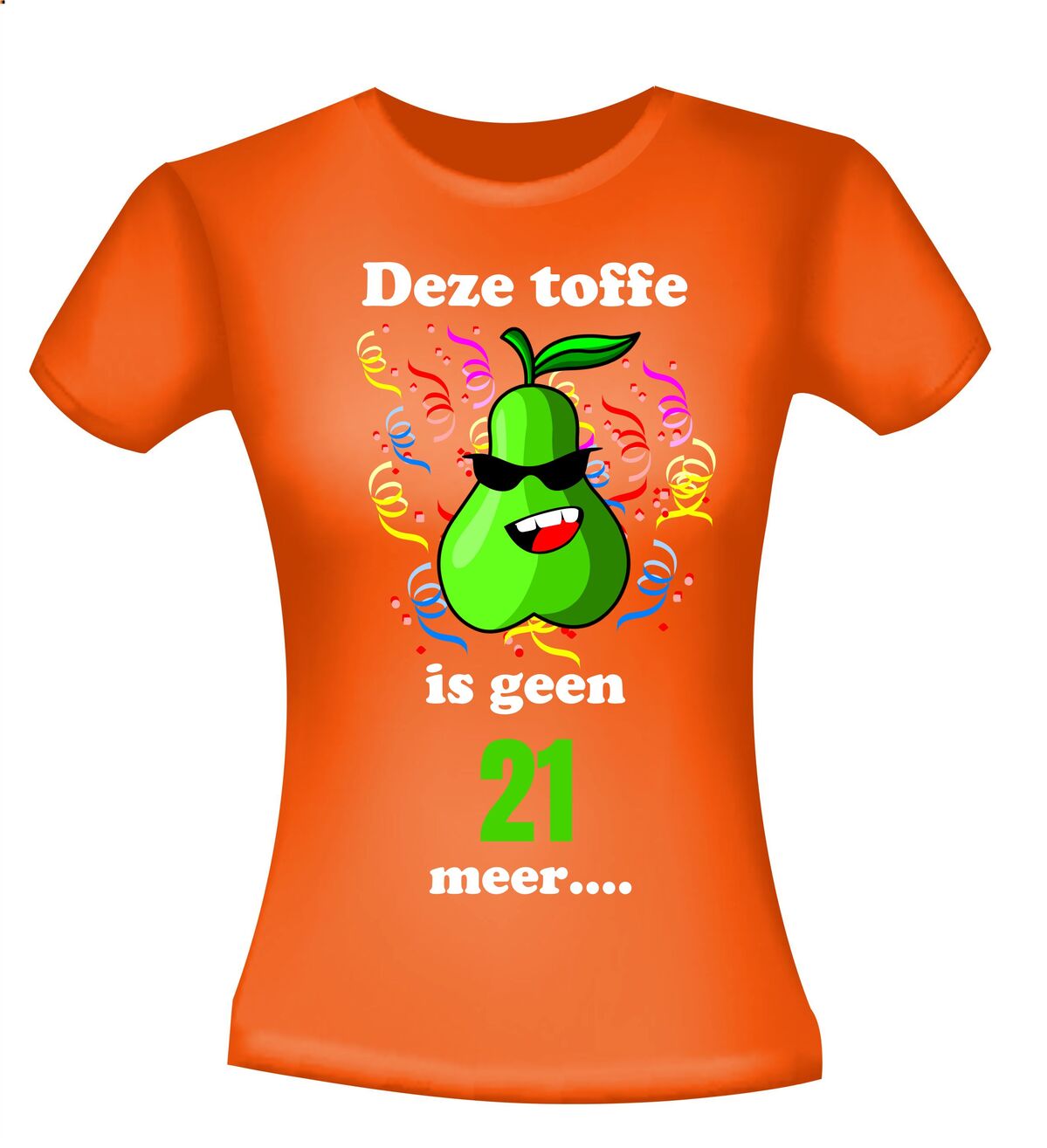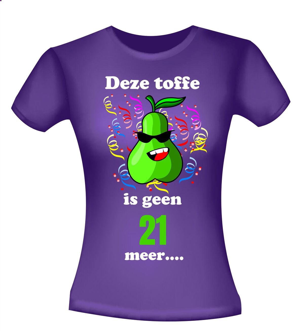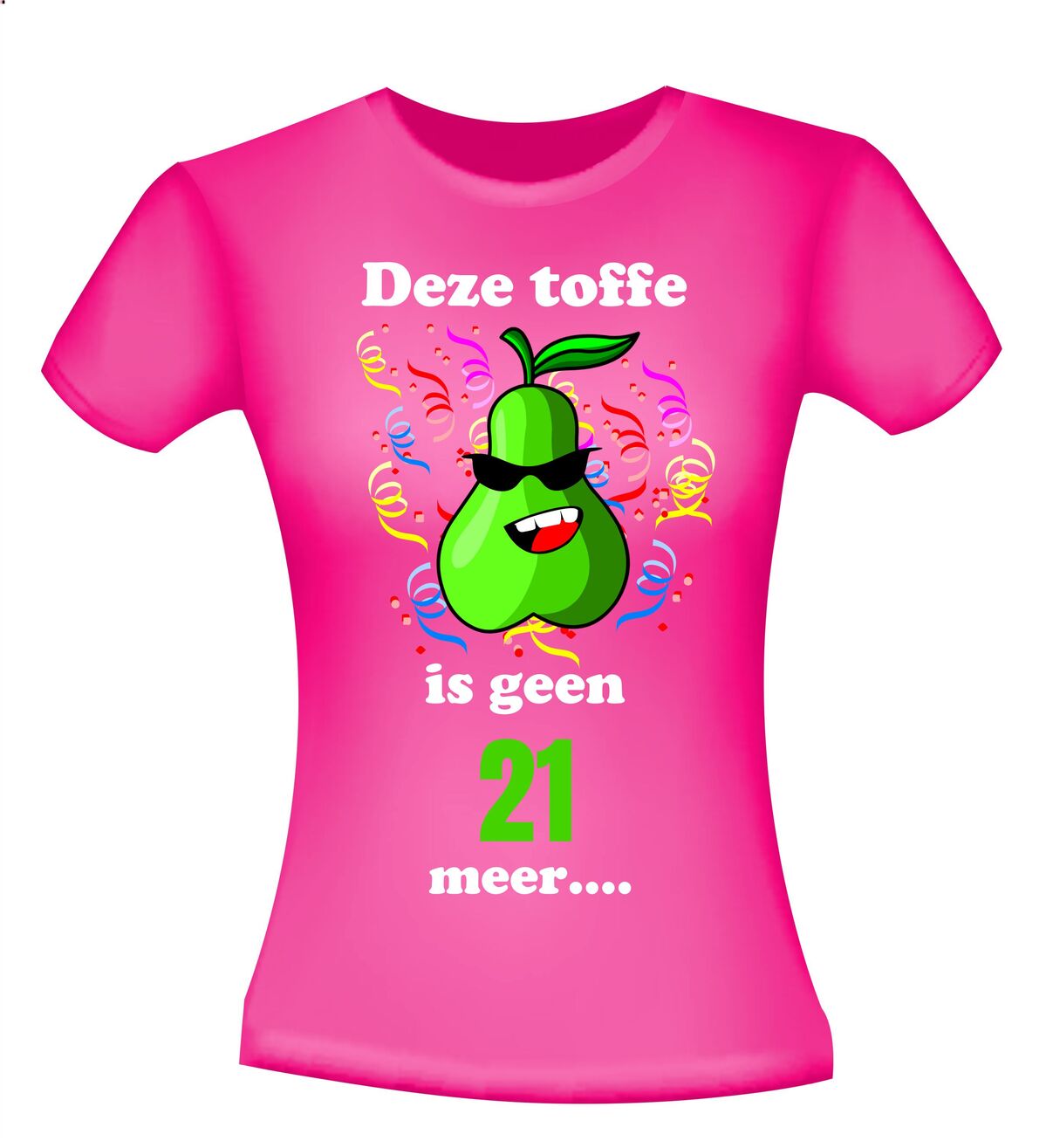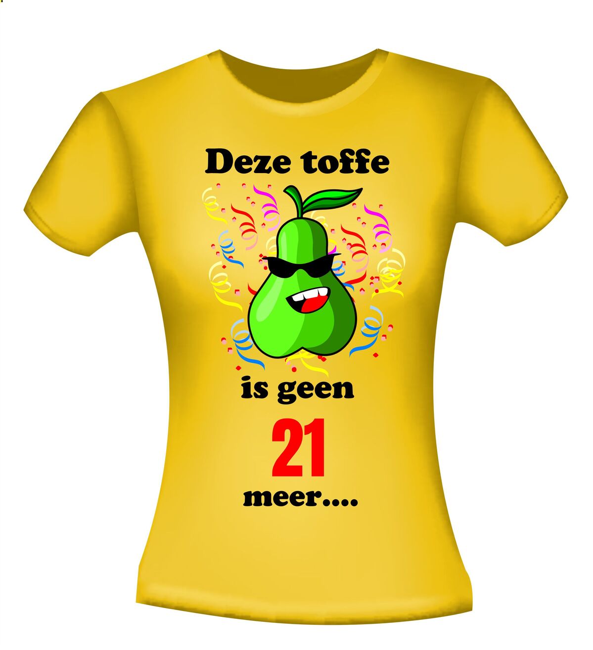 Fun shirt met de tekst: deze toffe peer is geen 21 meer. Leuk om kado te doen voor een 22e verjaardag. Met dit mooie full colour shirt staat de 22 jarige de gehele dag nog extra in het middelpunt van de belangstelling op zijn of haar verjaardag.