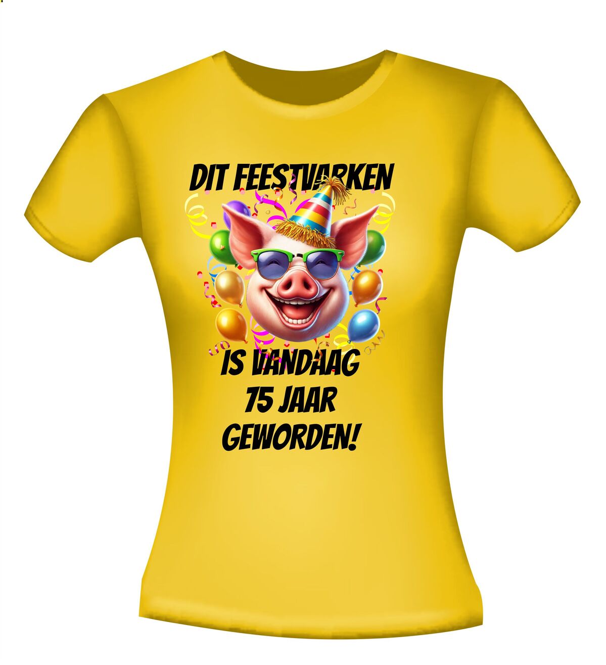 Leuk fun shirt voor een echt feestvarken die zijn of haar 75e verjaardag viert. Dit mooie full colour t-shirt met de tekst: dit feestvarken is vandaag 75 jaar geworden is een van de vele verjaardagsshirts en leeftijd shirts die wij uit voorraad kunnen leveren.