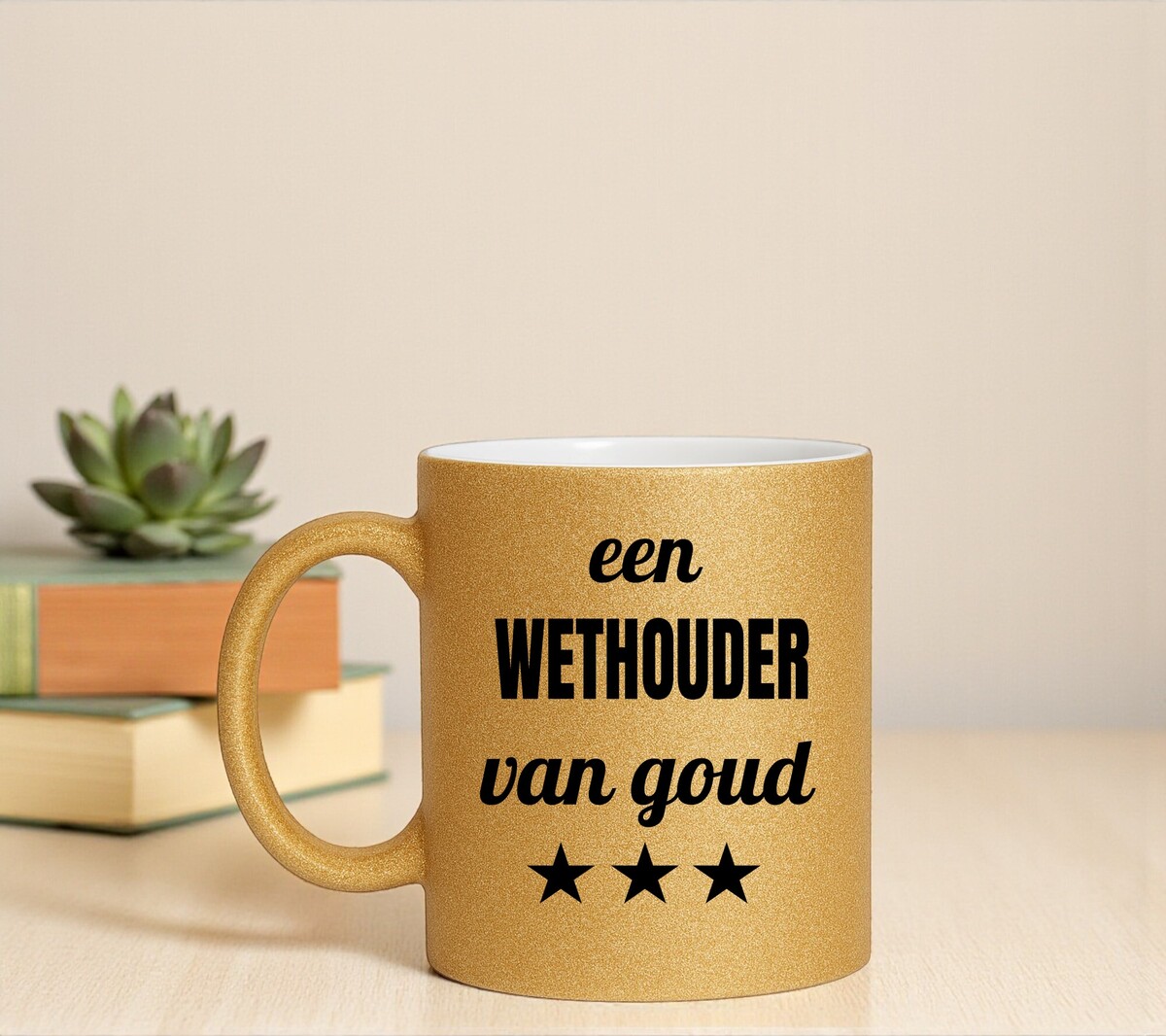 Deze beker in het glitter goud is een leuk en orgineel kado voor wethouder van goud.