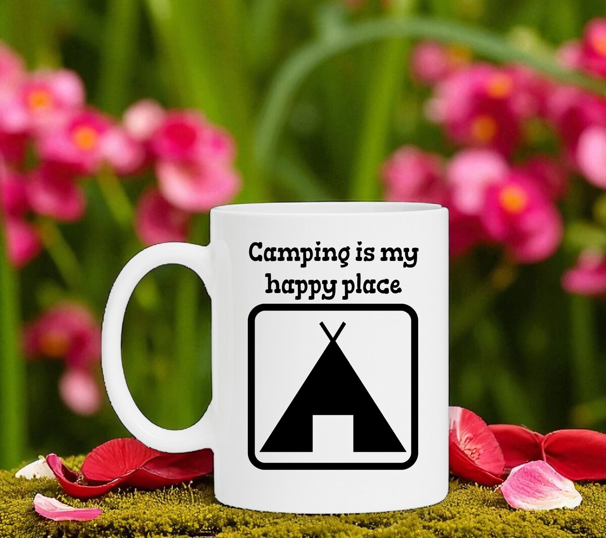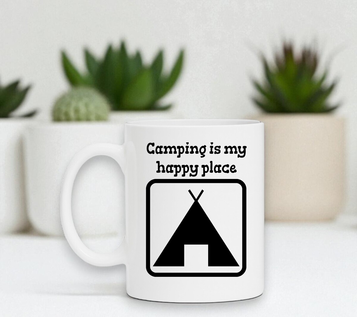 Leuke Mok voor op de camping! Camping is my happy place. De witte koffie of thee mok is vaatwasserbestendig en magnetronbestendig. De mok heeft een hoogte van 96mm en een diameter van 80mm.