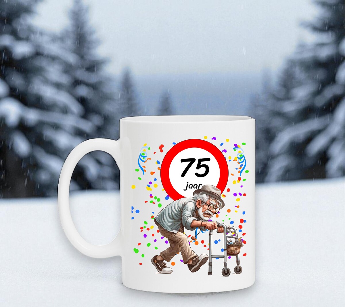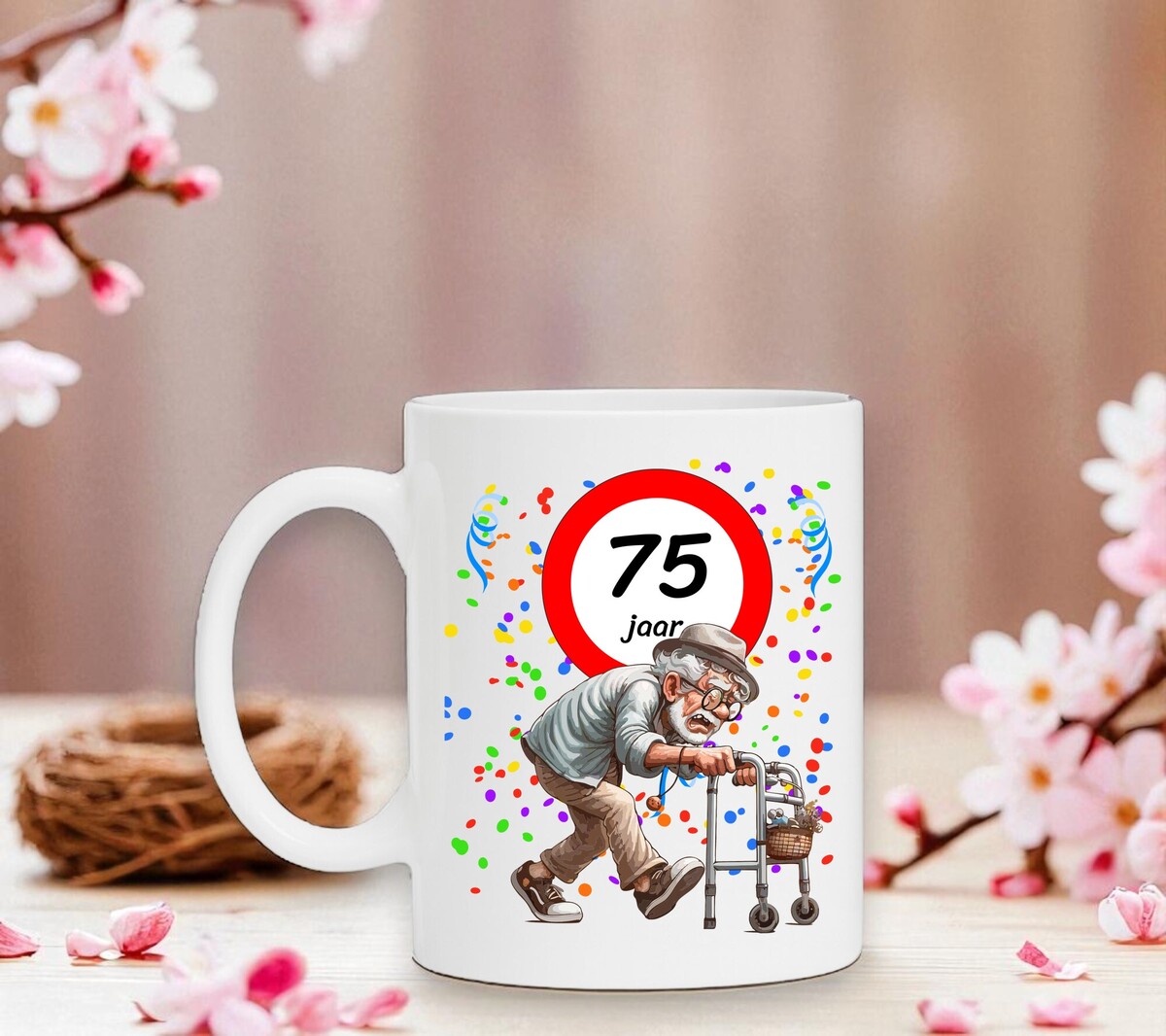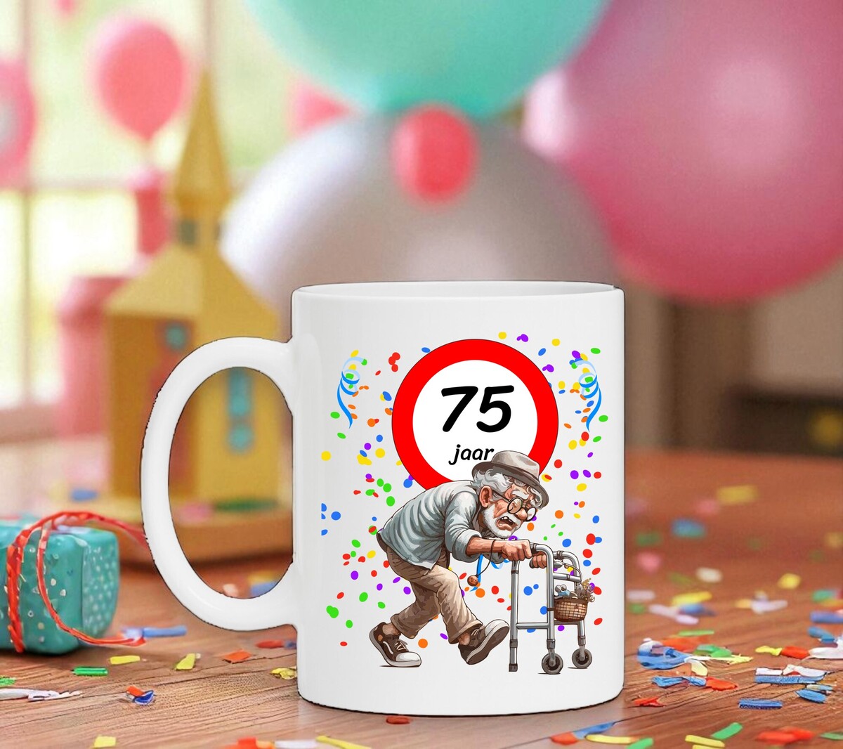 Zoek je een origineel en humoristisch cadeau voor een man die binnenkort 75 jaar wordt? Deze mok is precies wat je nodig hebt! Met een grappige afbeelding van een oude man en zijn rollator is dit de perfecte mok om de jarige te laten lachen en zijn mijlpaal te vieren met een knipoog. Perfect voor opa, vader, of een vriend die zijn leeftijd met trots en humor omarmt.