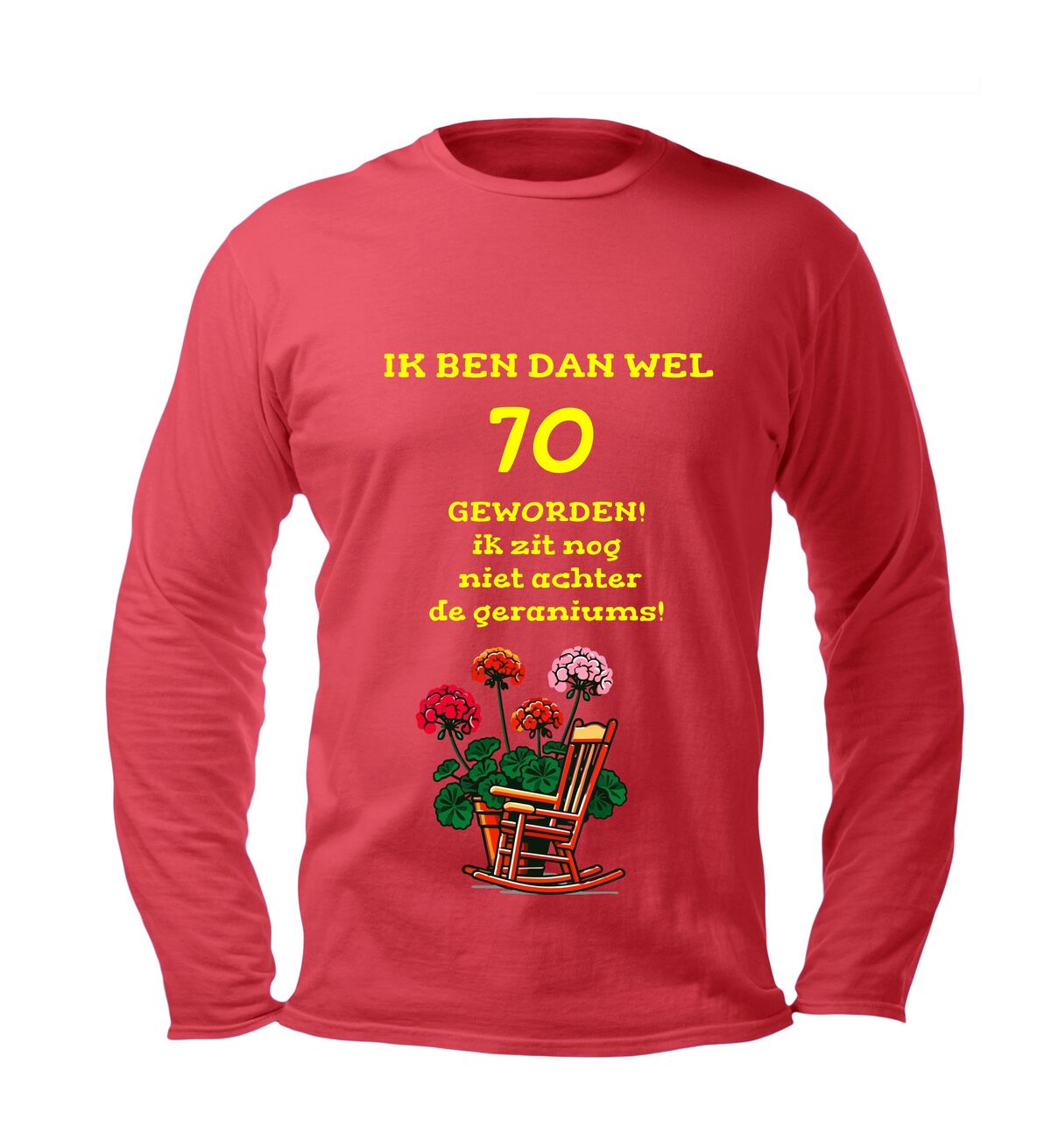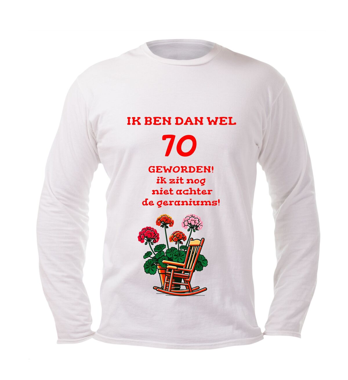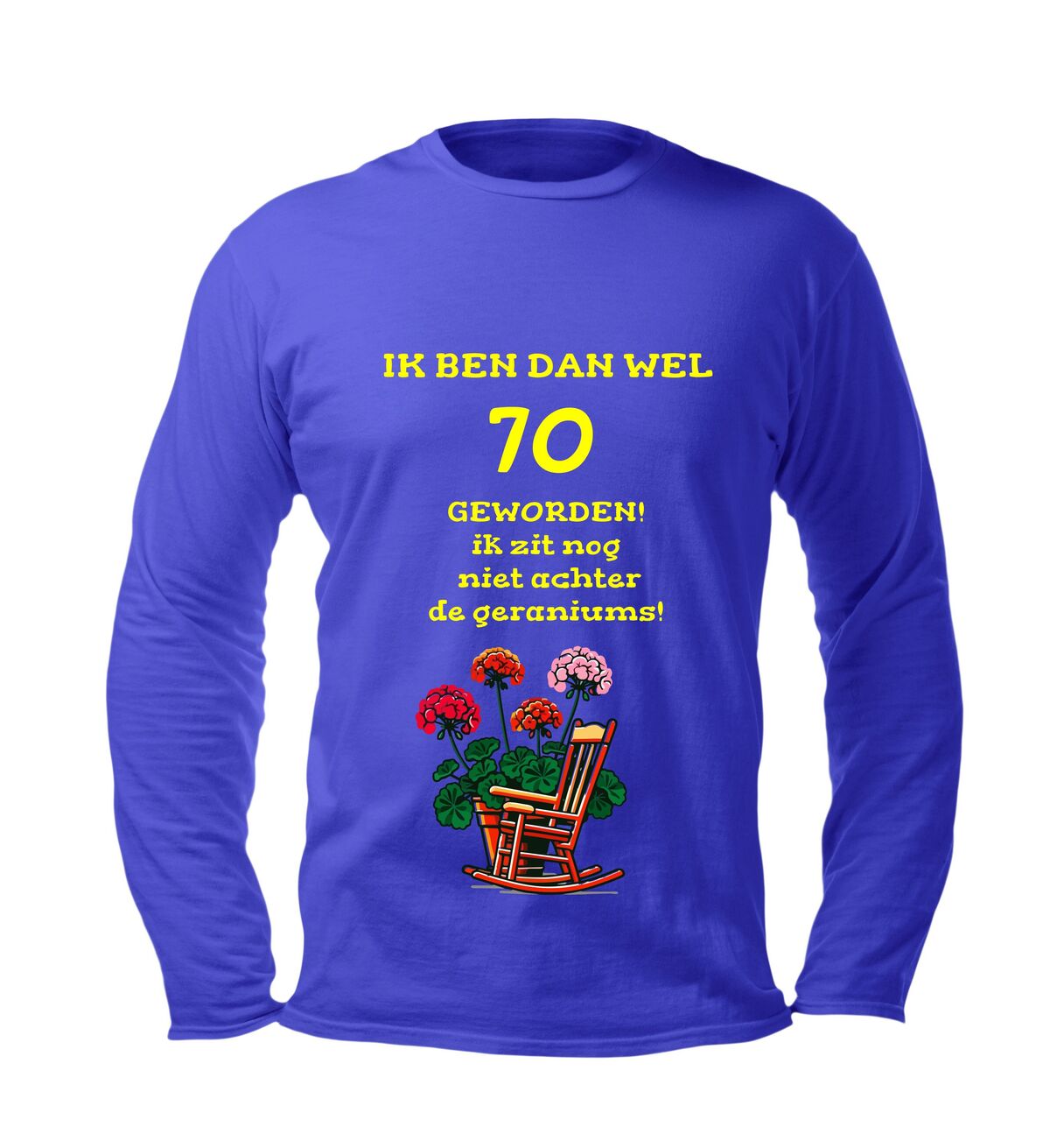 Vier deze prachtige mijlpaal met dit lange mouwen shirt met de tekst Ik ben dan wel 70 jaar maar zit nog lang niet achter de geraniums Deze 70 jaar longsleeve is perfect voor iedereen die trots is op zijn of haar leeftijd en met een knipoog wil laten zien dat stilzitten geen optie is. De humoristische tekst maakt dit shirt een echte blikvanger tijdens een verjaardag en zorgt gegarandeerd voor lachende gezichten.
