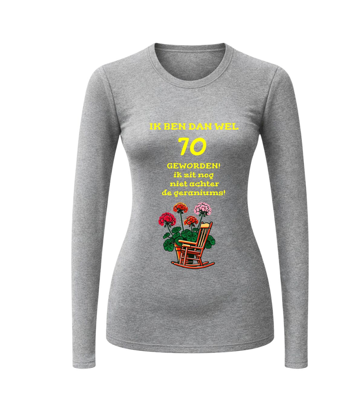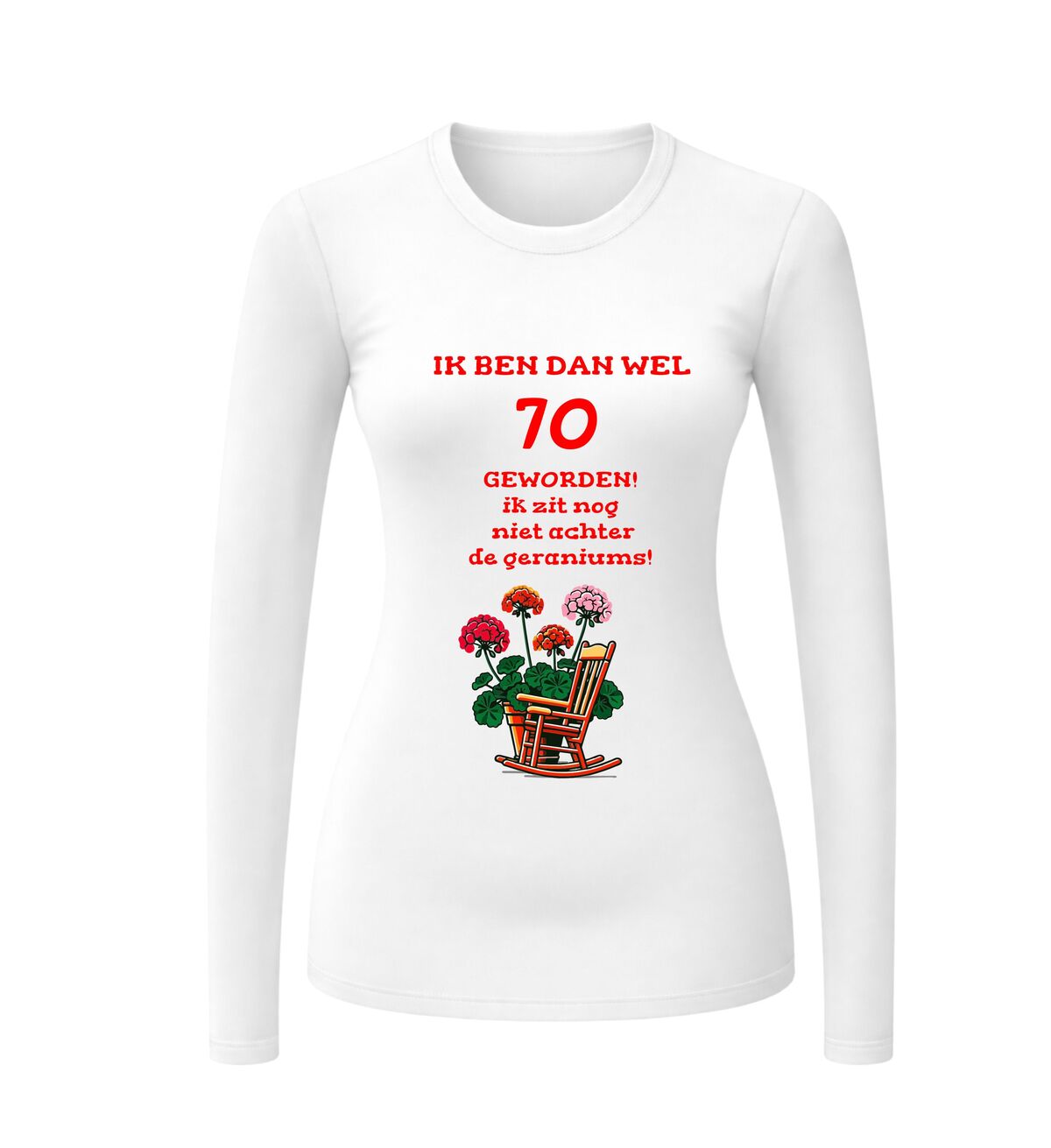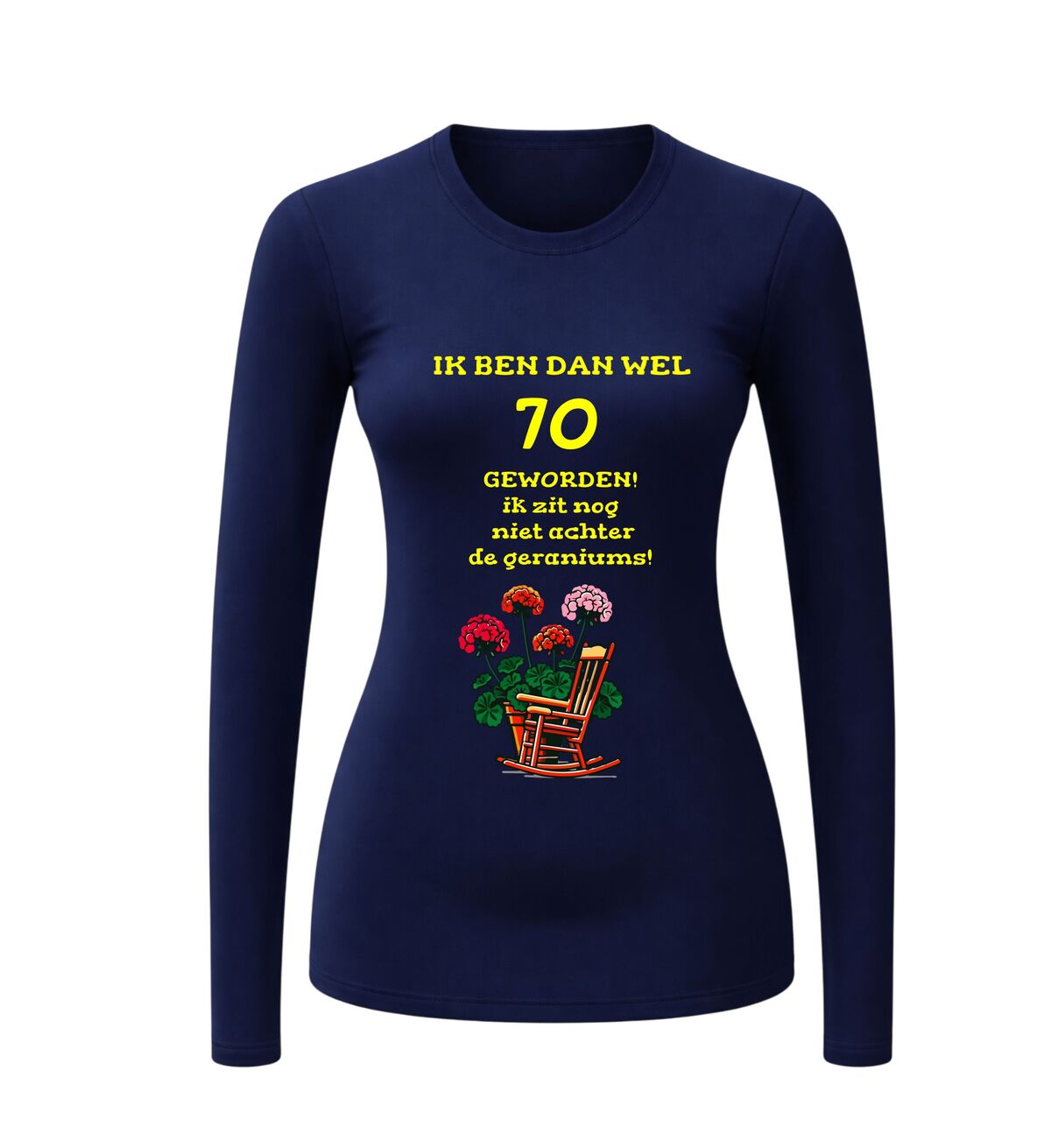Vier deze prachtige mijlpaal met dit lange mouwen shirt met de tekst Ik ben dan wel 70 jaar maar zit nog lang niet achter de geraniums Deze 70 jaar longsleeve is perfect voor iedereen die trots is op zijn of haar leeftijd en met een knipoog wil laten zien dat stilzitten geen optie is. De humoristische tekst maakt dit shirt een echte blikvanger tijdens een verjaardag en zorgt gegarandeerd voor lachende gezichten.