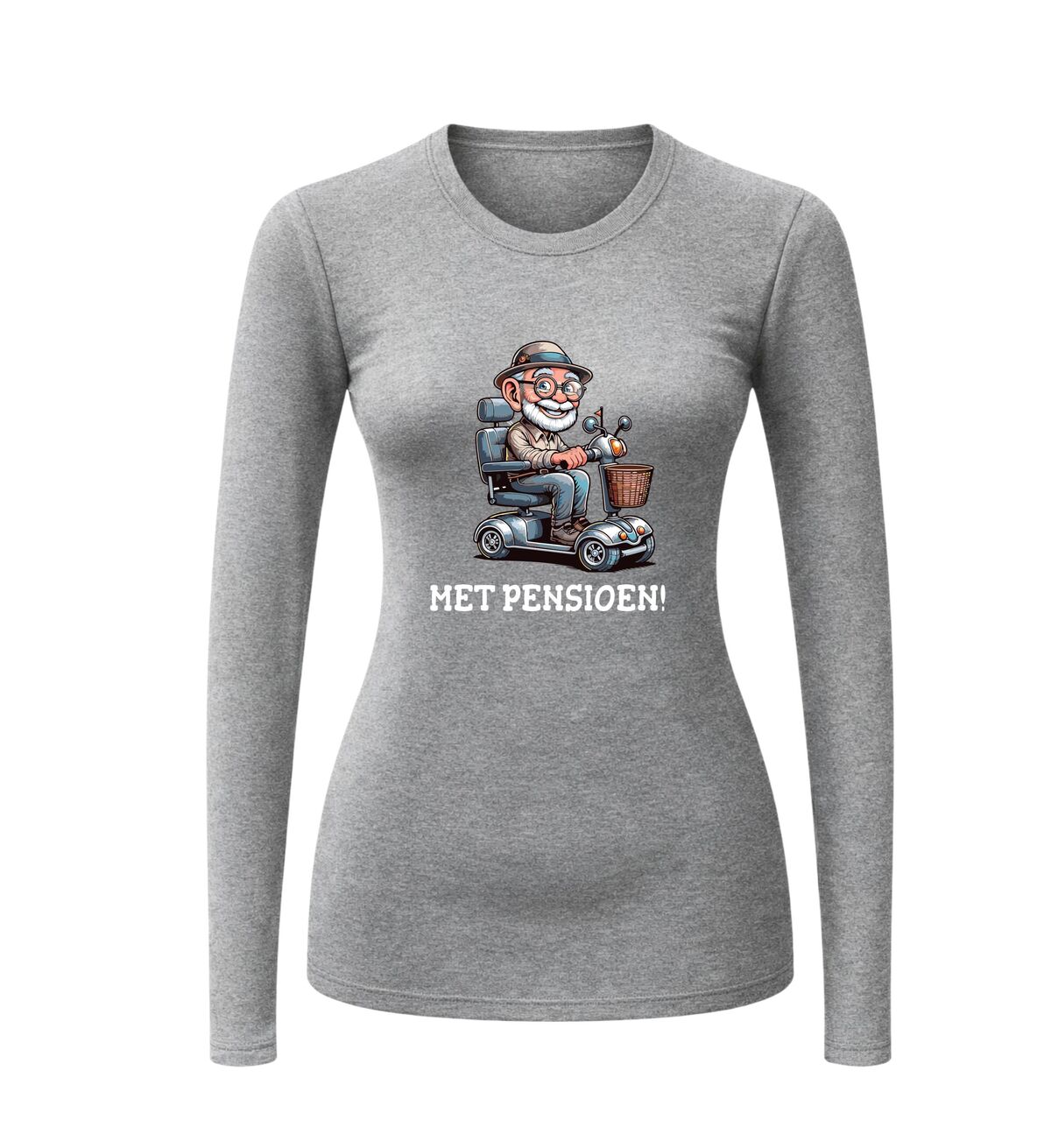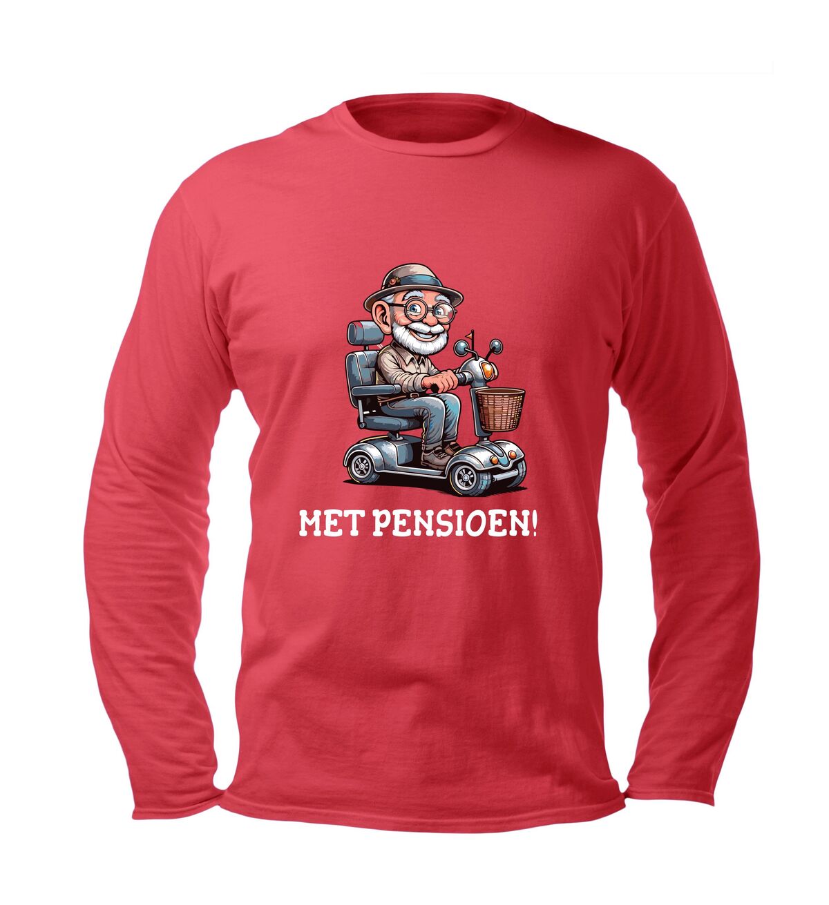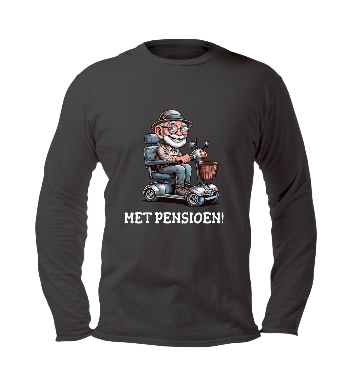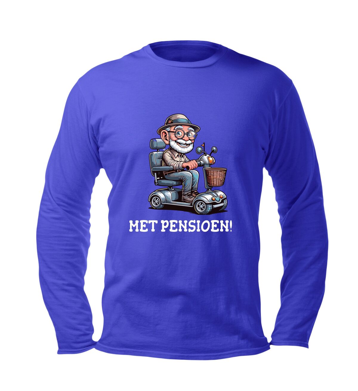 Na jaren hard werken is het eindelijk zover: de werkbroek uit, de vrije tijd in! Deze longsleeve met de vrolijke tekst “Met pensioen” en een grappige scootmobiel-opdruk is hét perfecte cadeau voor iedereen die de werkvloer heeft ingeruild voor een leven vol rust, koffie, en een tikkie ondeugende vrijheid.